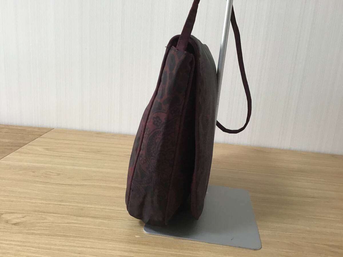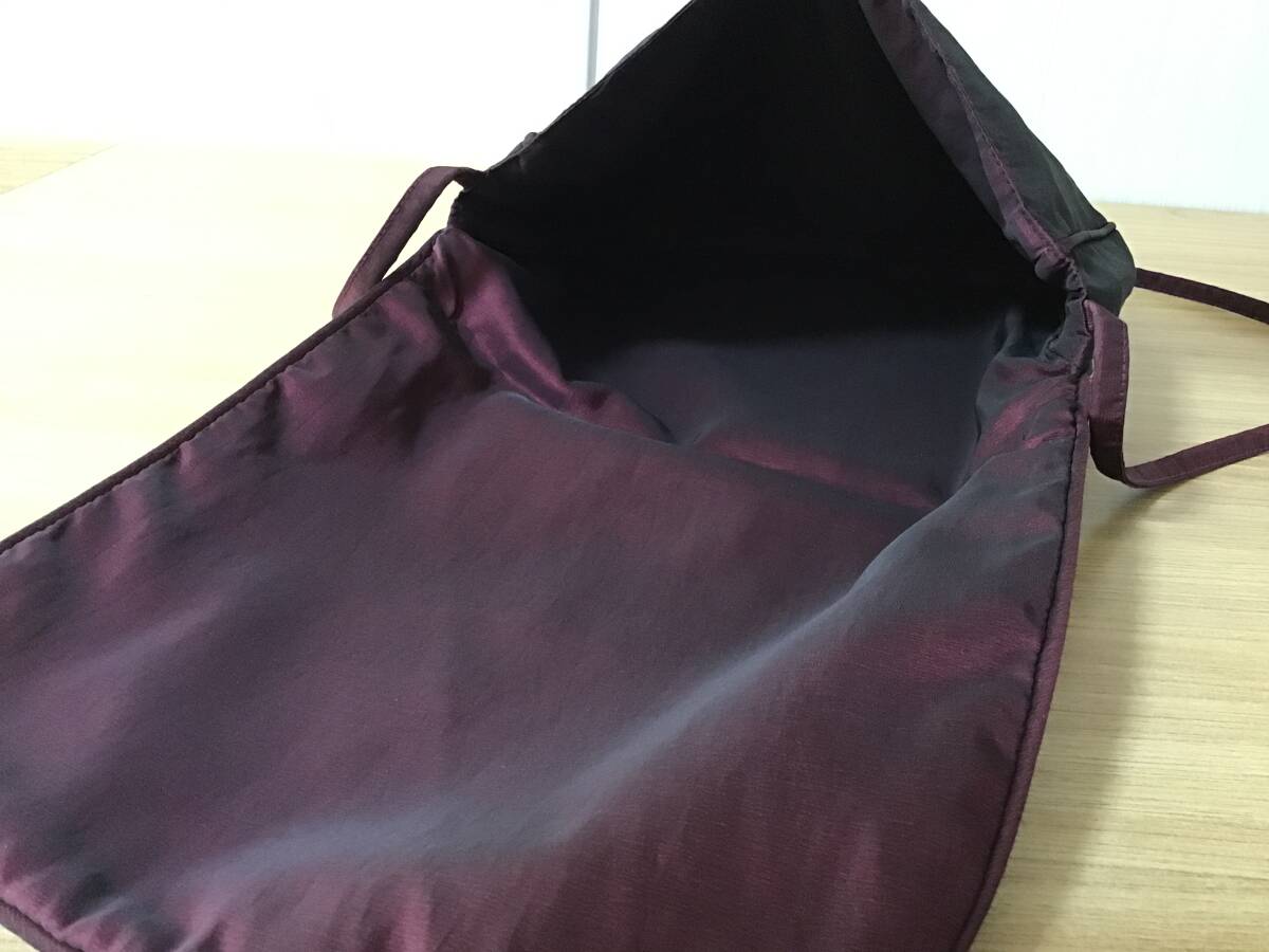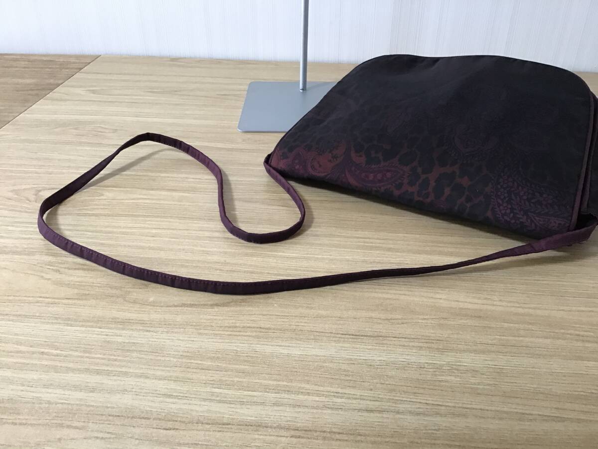 サイズ:縦26cm、横27cm、まち底で5.5cm、ストラップは104.5cm、開口部はふたかぶせで留め具無し