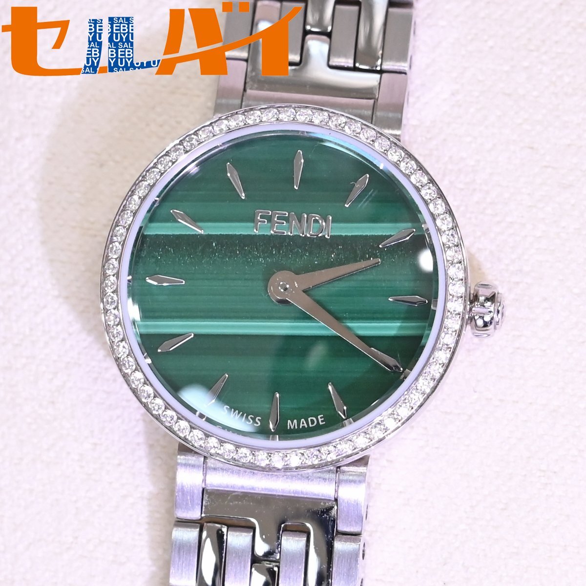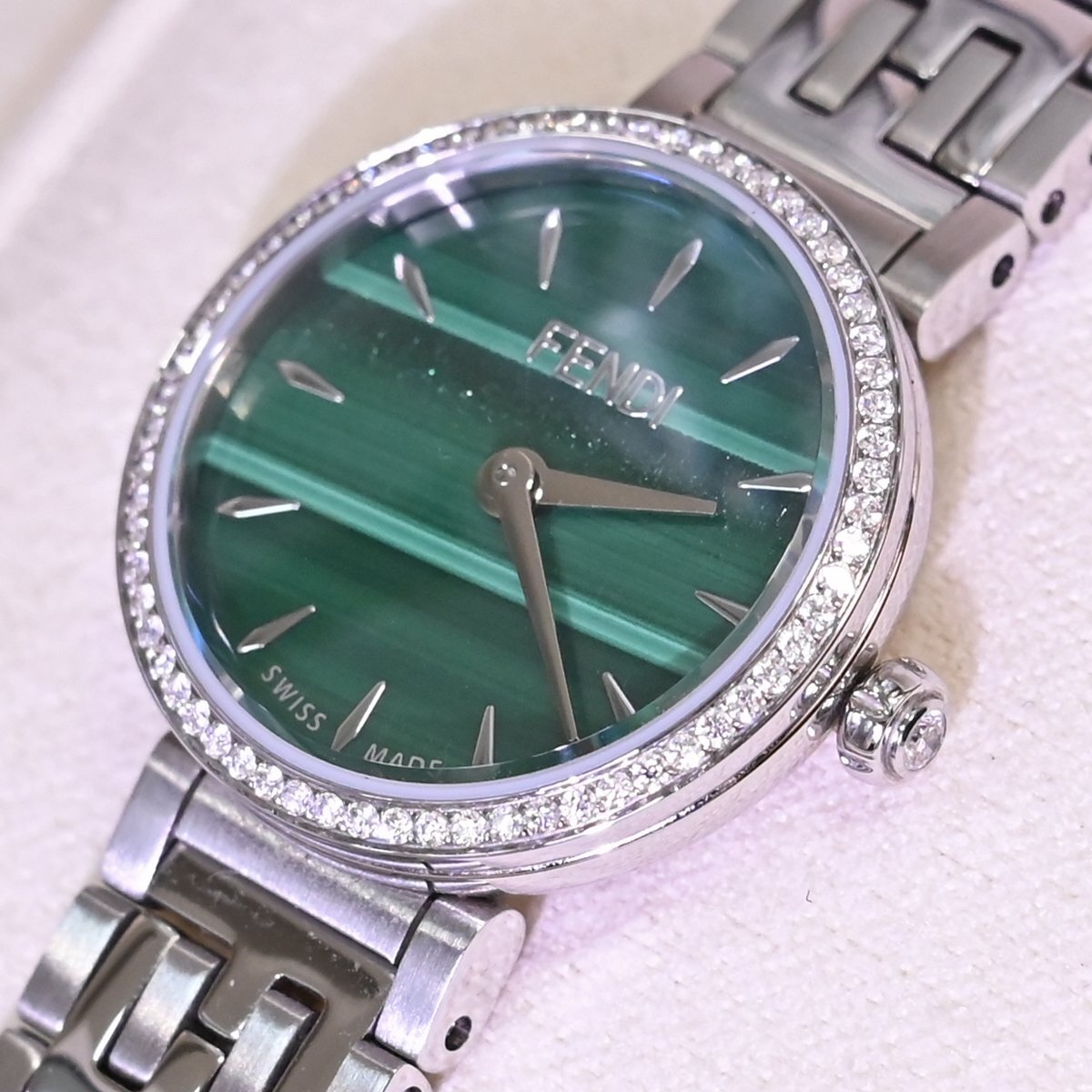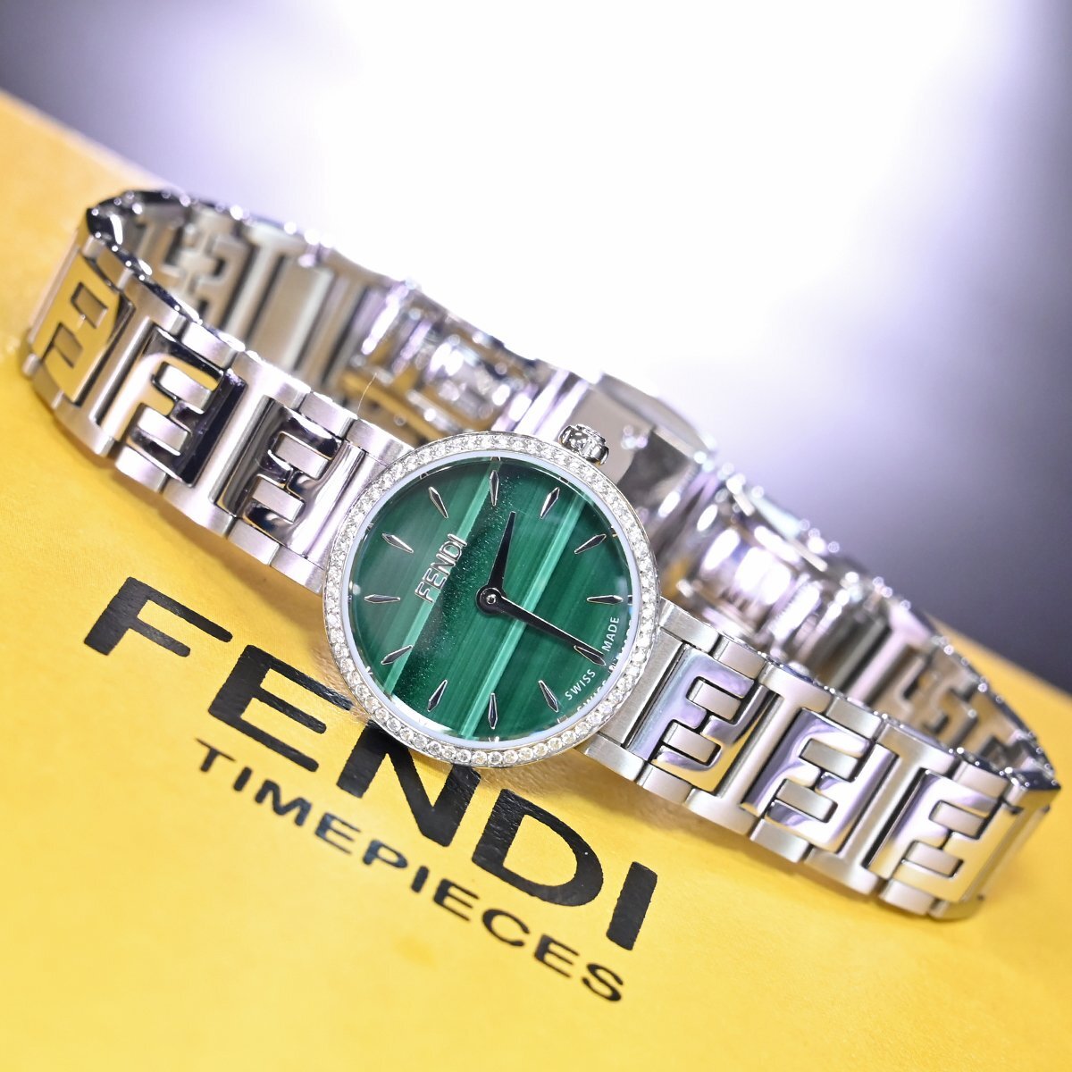 フェンディの純正フルダイヤモンド 孔雀石文字盤 ハイジュエリーウォッチです。 エレガントでクラシカルなデザインが特徴。 フェンディのアイコニックなスタイルを反映し、高級感と洗練された美しさを兼ね備えています。 多彩なモデル展開の中でもこちらは孔雀石文字盤を取り囲む最高級ダイヤモンドがラグジュアリーな一本です。 ブランドのシグネチャーデザインである「FF」ロゴのステンレスベルトも目を引きます。 市場にも全く出て来ないモデルなのでお探しの方も非常に多いかと思います。 ※基本動作確認済。 |