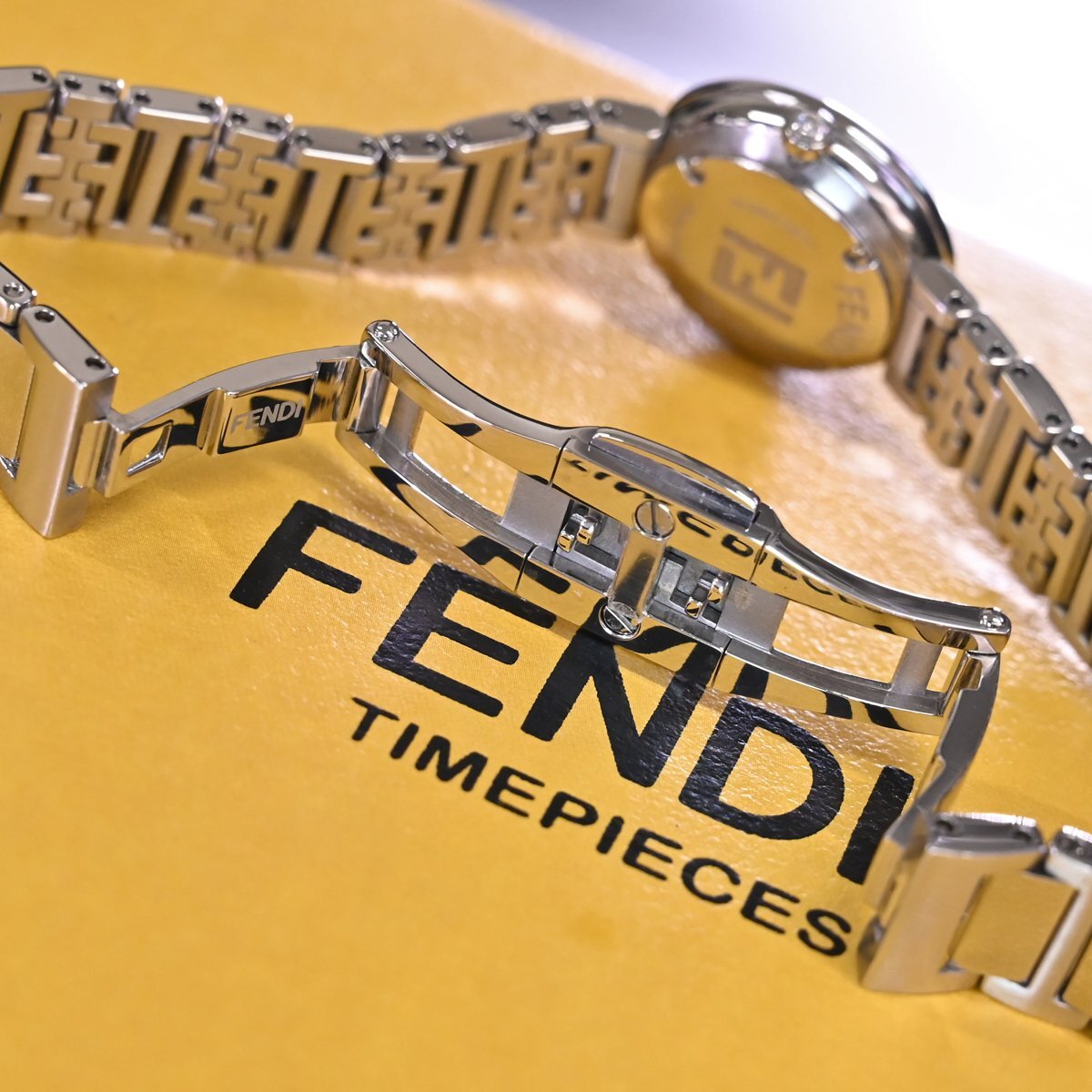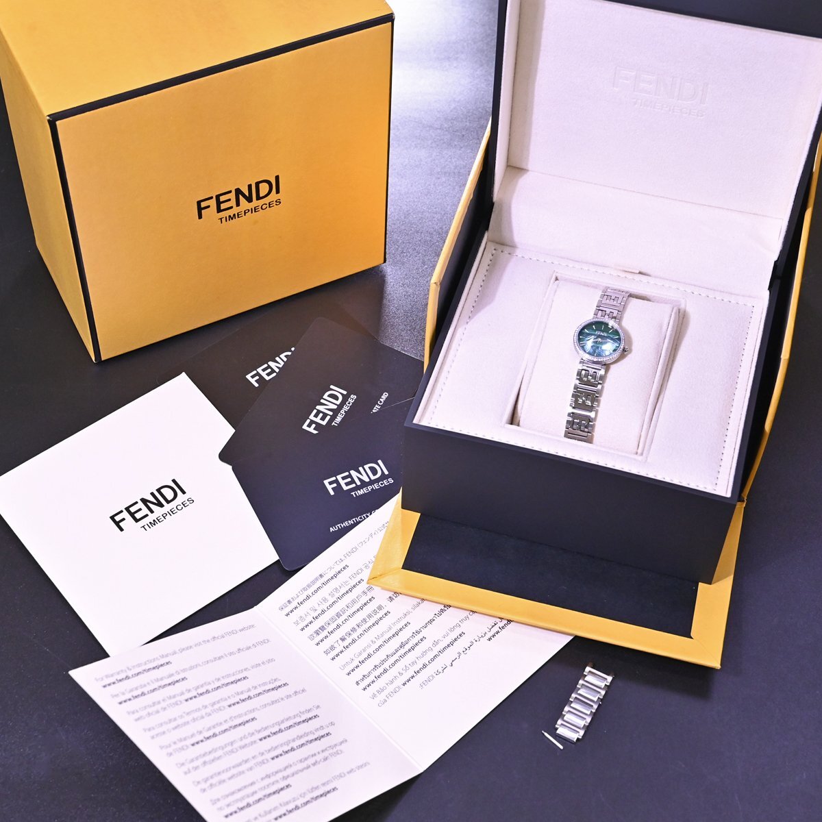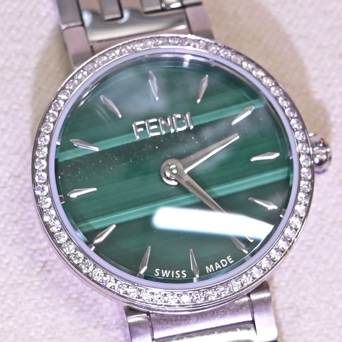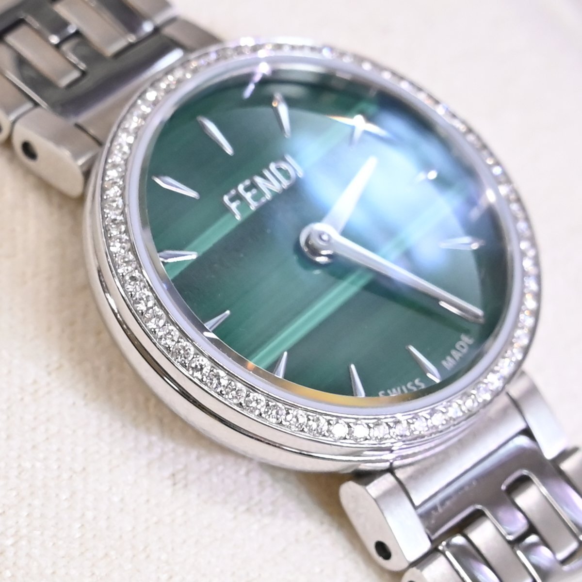フェンディの純正フルダイヤモンド 孔雀石文字盤 ハイジュエリーウォッチです。 エレガントでクラシカルなデザインが特徴。 フェンディのアイコニックなスタイルを反映し、高級感と洗練された美しさを兼ね備えています。 多彩なモデル展開の中でもこちらは孔雀石文字盤を取り囲む最高級ダイヤモンドがラグジュアリーな一本です。 ブランドのシグネチャーデザインである「FF」ロゴのステンレスベルトも目を引きます。 市場にも全く出て来ないモデルなのでお探しの方も非常に多いかと思います。 ※基本動作確認済。 |