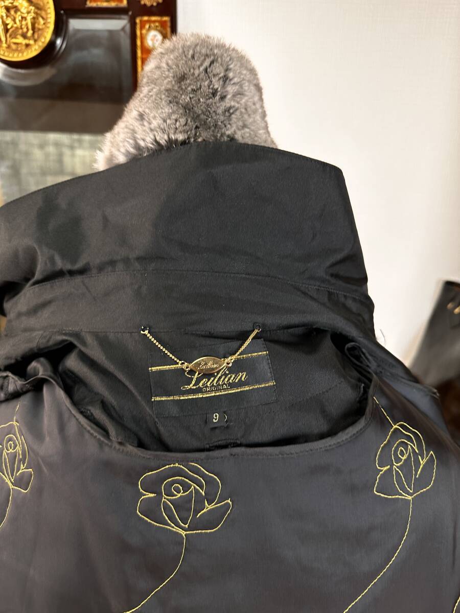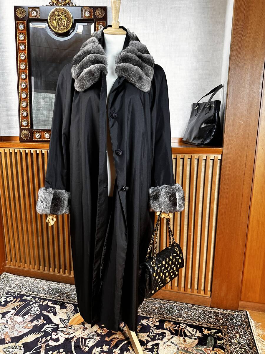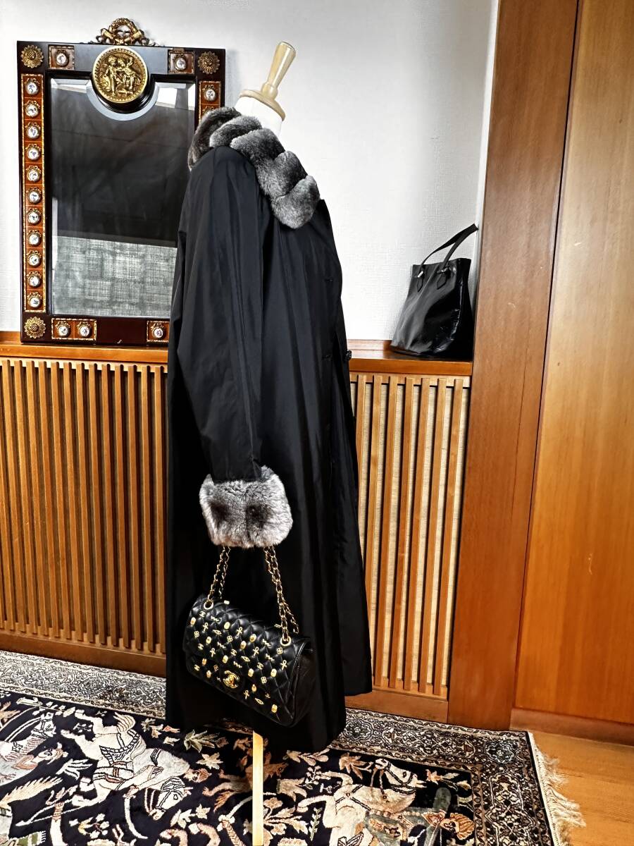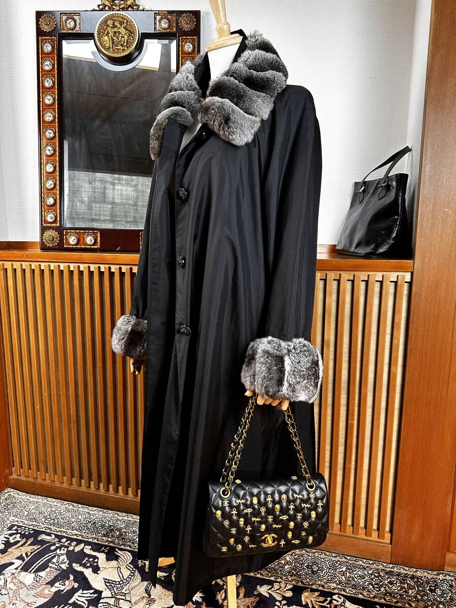 着丈115cm。レリアンのチンチラ毛皮のお襟とカフ(取り外し可)のシルク100%のコート!