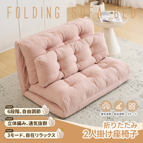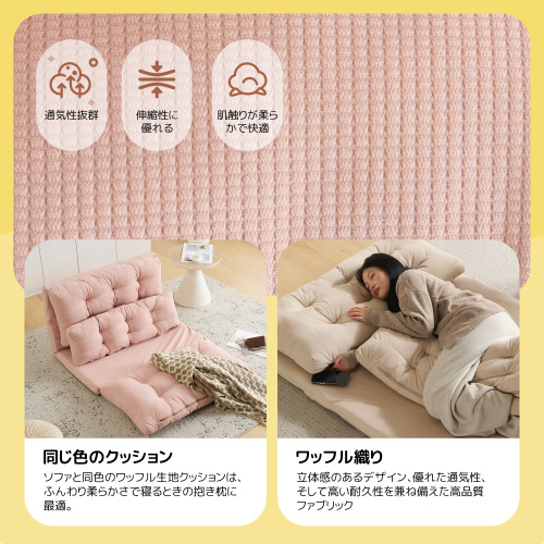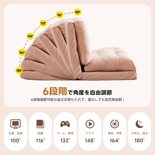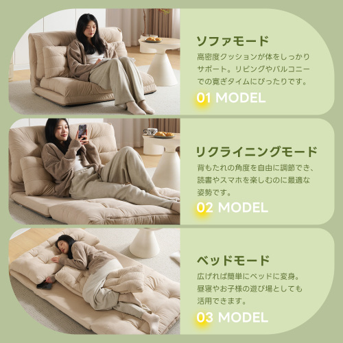 • ★【変幻自在に 自分好みの角度に】背面には6段階のリクライニング調節機能付き。細かな調節が可能なので、体勢に合わせてベストな角度で、ゆっくりと寛げます。さらにソファ時は座面を重ねてボリュームUP。上部のクッションは座った時のふかふか感や気持ちよさを追求。下部のクッションは少し硬めでより長く使用していただく為の 土台の役目を果たします。異なる硬さに設定したことで絶妙な座り心地、寝心地を実現しました。映画鑑賞などのゆったりしたい時はカウチスタイル、急な来客時などは簡易ベッドとして、様々なシーンに活躍します。ソファスタイルでもダブルクッションでゆったりと寛げいただけます。