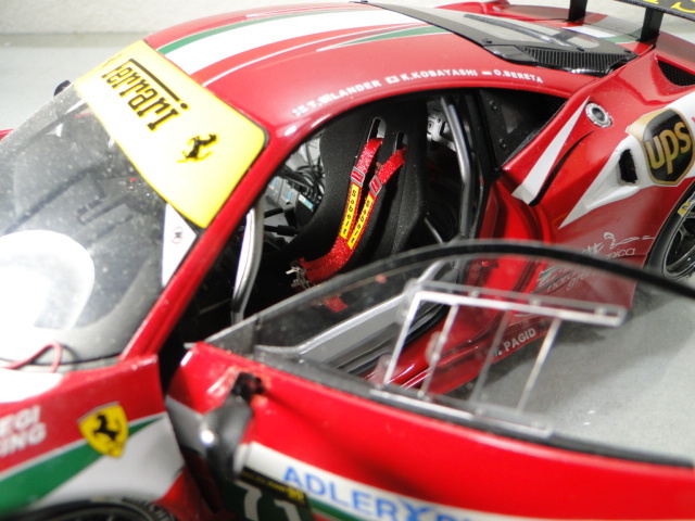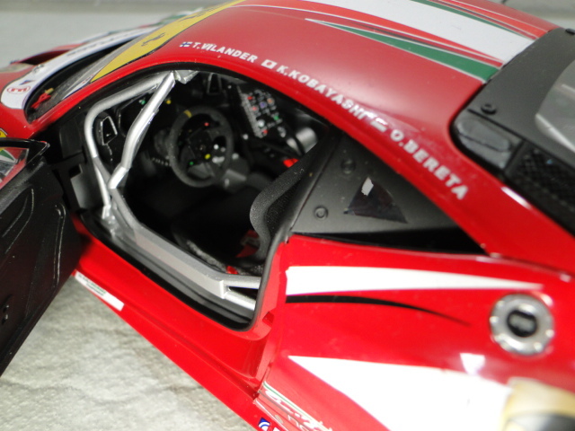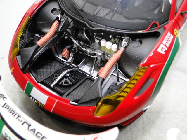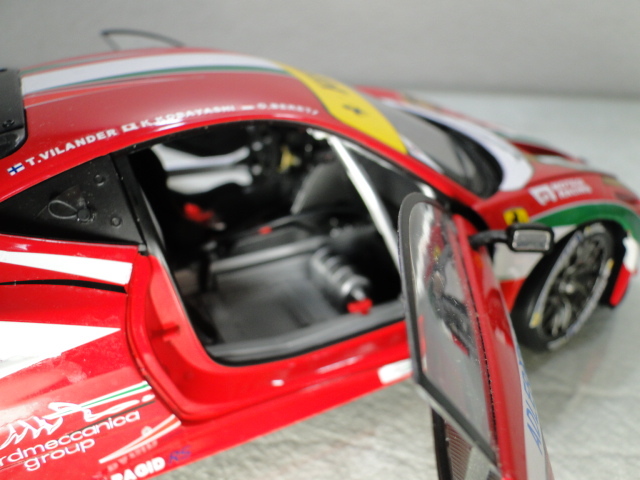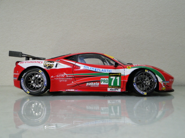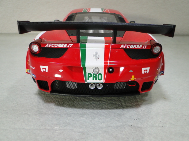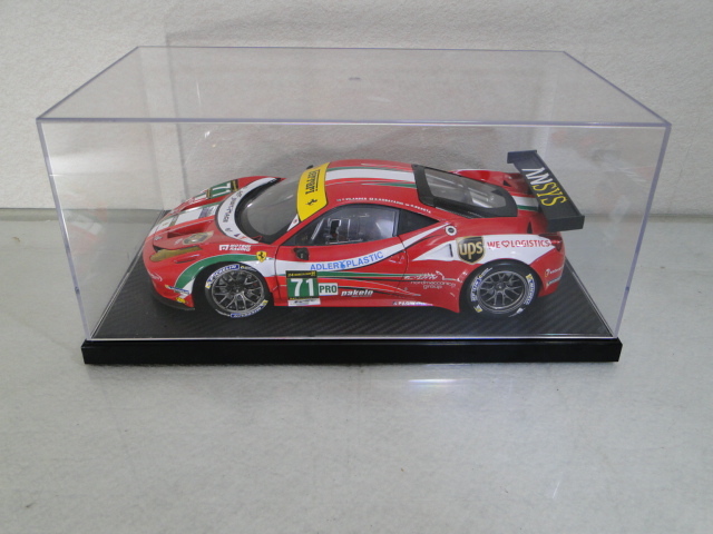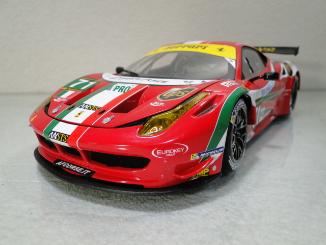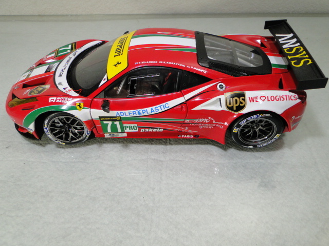 HWエリートの458GT3をミュージアムコレクションのデカールを使用し2013年のル・マン仕様へカスタムしました。実車とはサイドミラーやホイールのデザインが異なります、その他細かな箇所の違いも有ります。デカール加工後にトップコートは噴いていません、加工後3年位は経過していますがデカールに大きな割れは有りません。ホイールとヘッドライトを実車様に塗装しています、サイドミラーが左右共に折れてしまったので補修しています。元箱は有りません、底面にカーボンシートを貼ったディスプレイケースに入れてお届けします。梱包には注意を払いますが配送時の振動等で部品が脱落した場合は落札者様で補修をお願い致します。素人のカスタム品ですのでジャンク扱いでお願い致します。発送サイズは80です。 よろしくお願い致します。