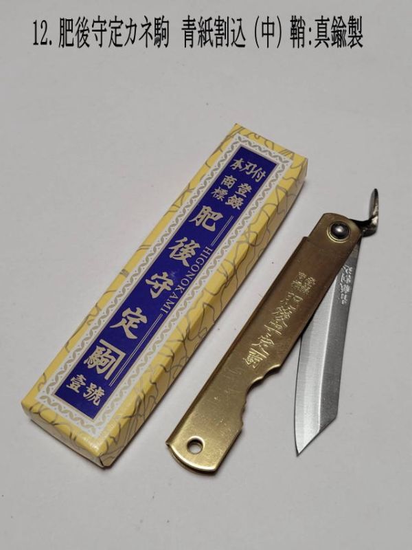 12. “ザ・肥後守” 肥後守定カネ駒 青紙割込 (中サイズ) 鞘:真鍮製 箱付 和式折りたたみナイフ 【アウトドア・DIYに大人気】