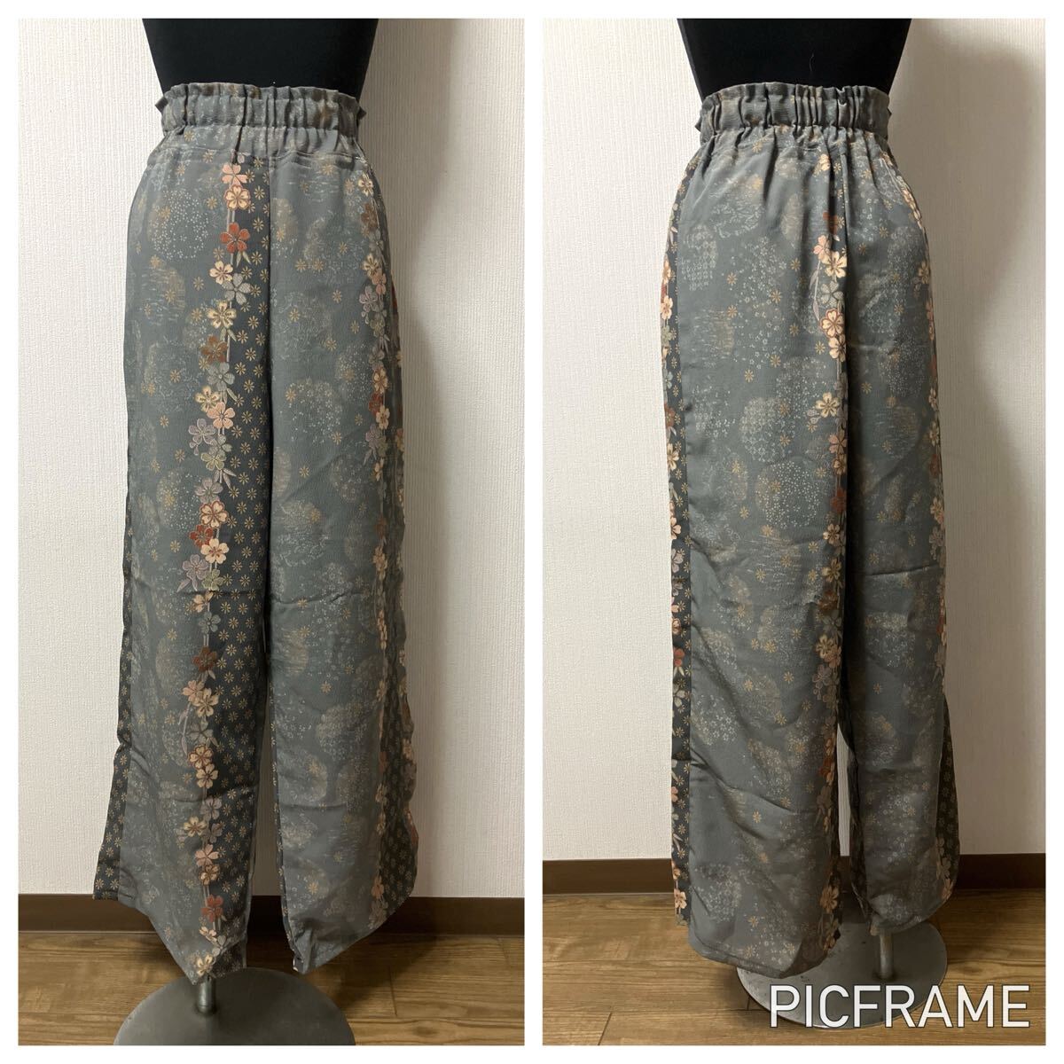 花柄デザインのグレーのワイドパンツ、ゴムウエストで快適な着心地。