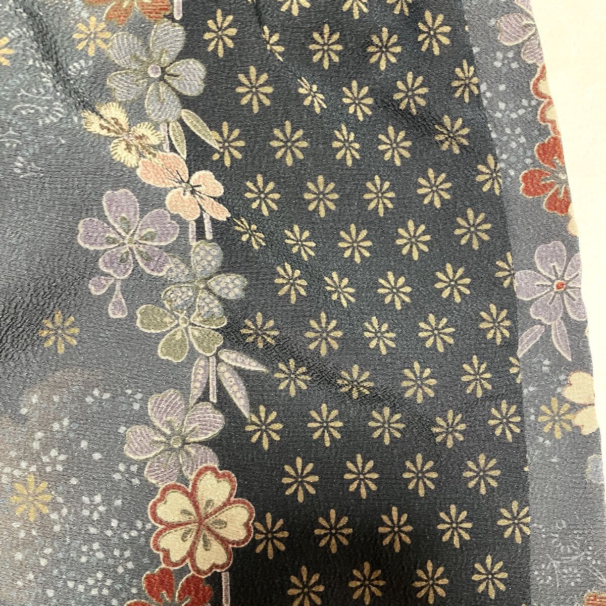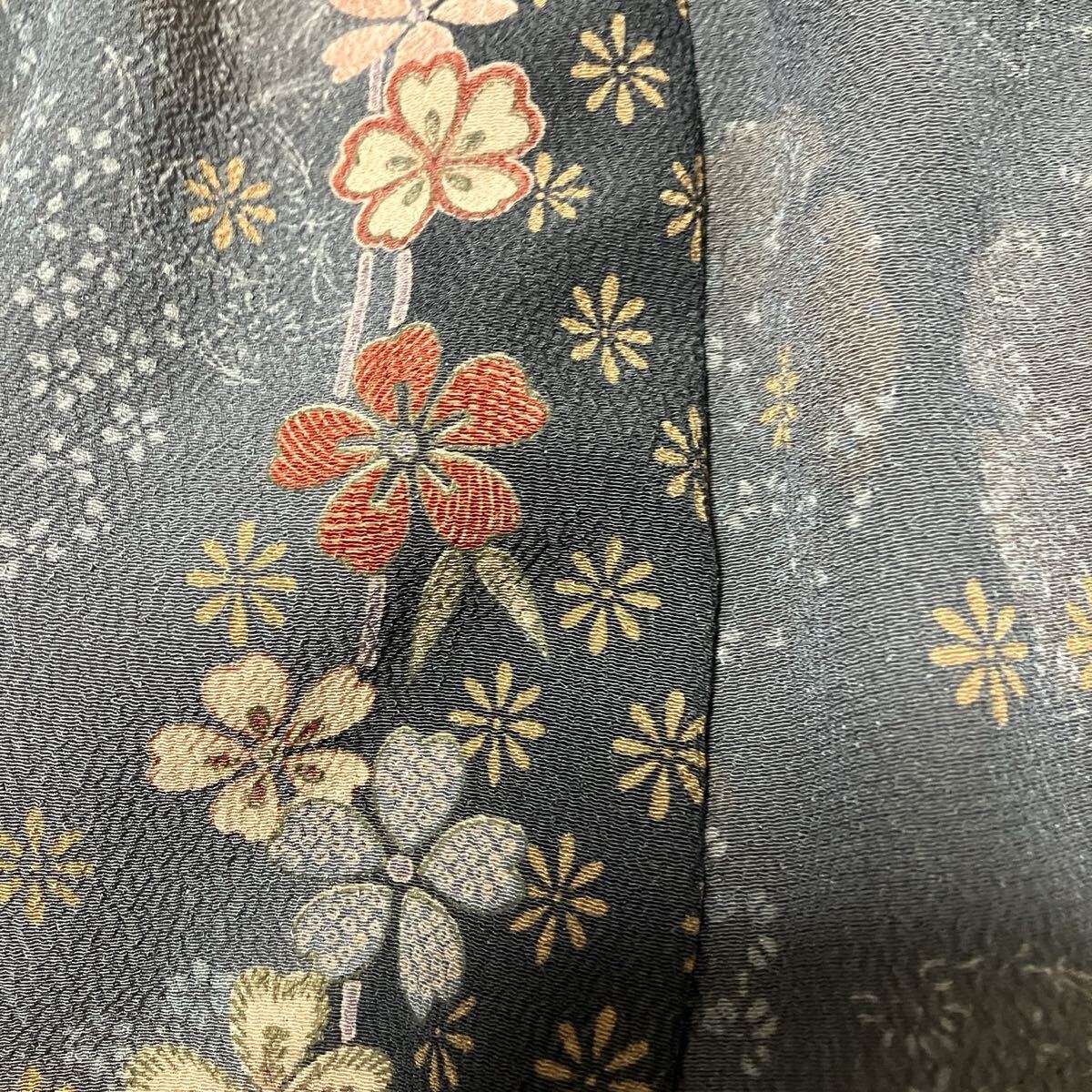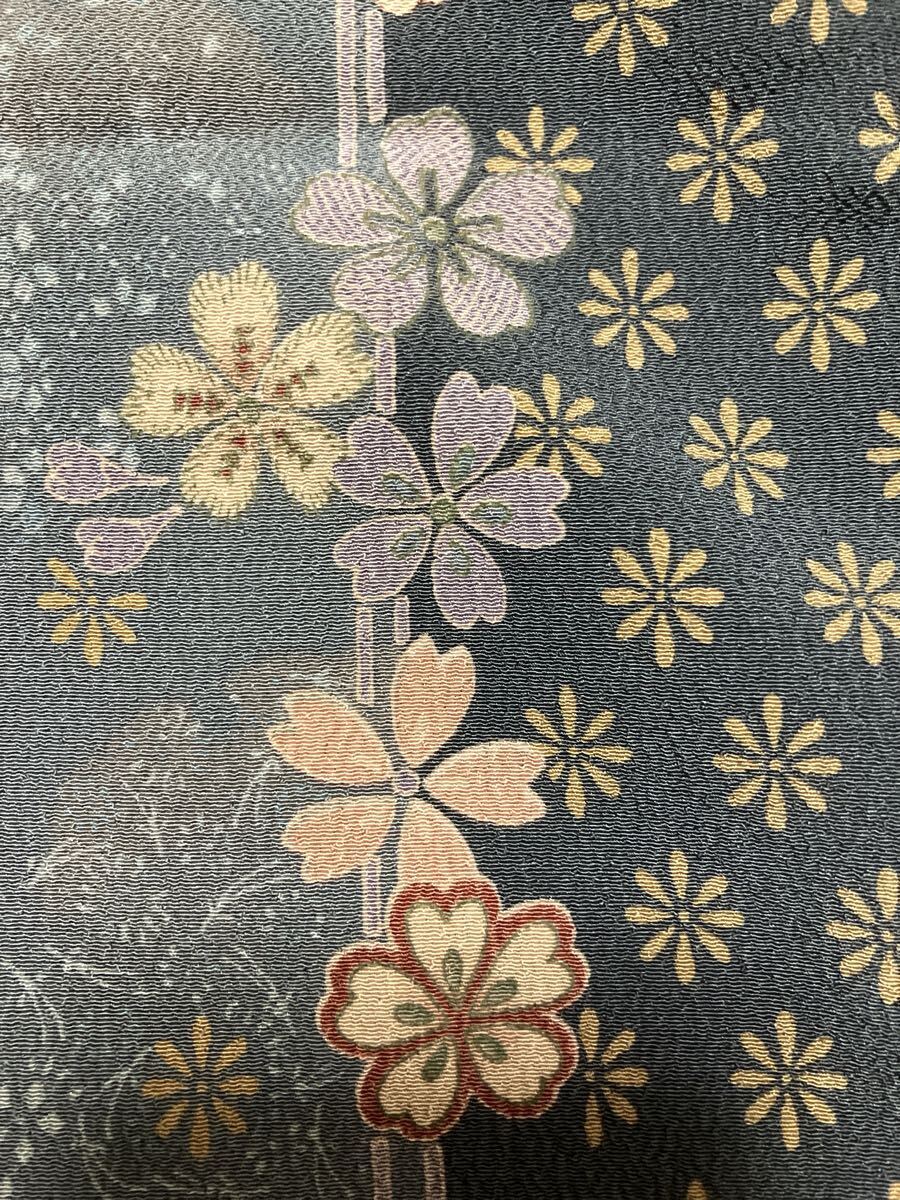 古典的な流水模様と紅葉や竹・梅などの友禅柄が、存在感のある着物地です。