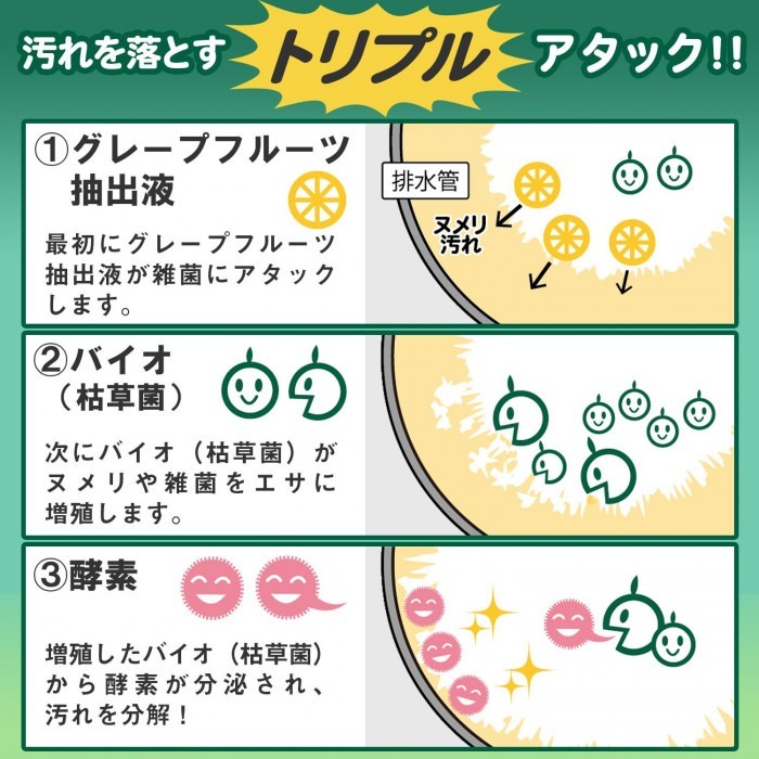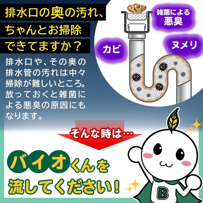◆ 排水管洗浄ヌメリとりバイオくん ◆ 長期間に溜まった排水口の汚れやヌメリを落とします。 注:写真はイメージです。 【商品仕様】 |