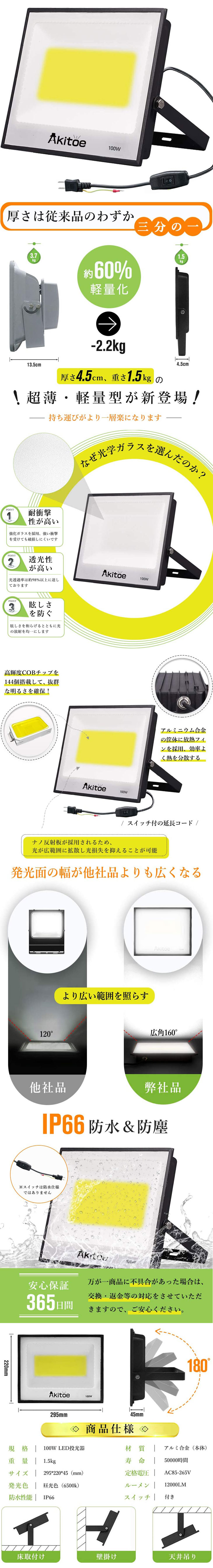◆軽薄化LED投光器:1.5KGの軽量だから壁への負担を掛けずに壁掛けが可能、駆動内蔵設計で投光器の厚さはわずか4.5CMでよりスッキリと設置できます。