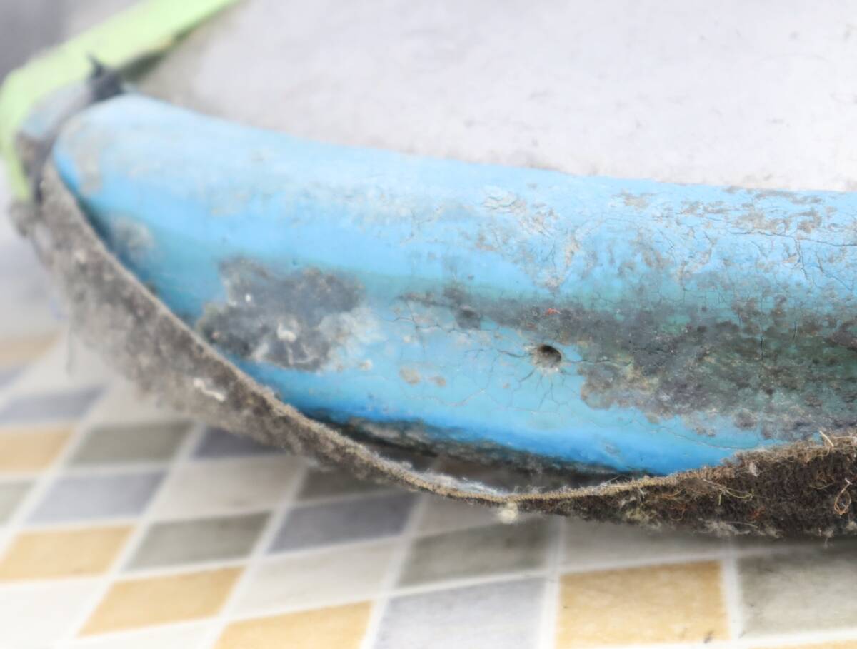 下の青いゴムの部分が経年劣化で外れている為、養生テープで貼られています