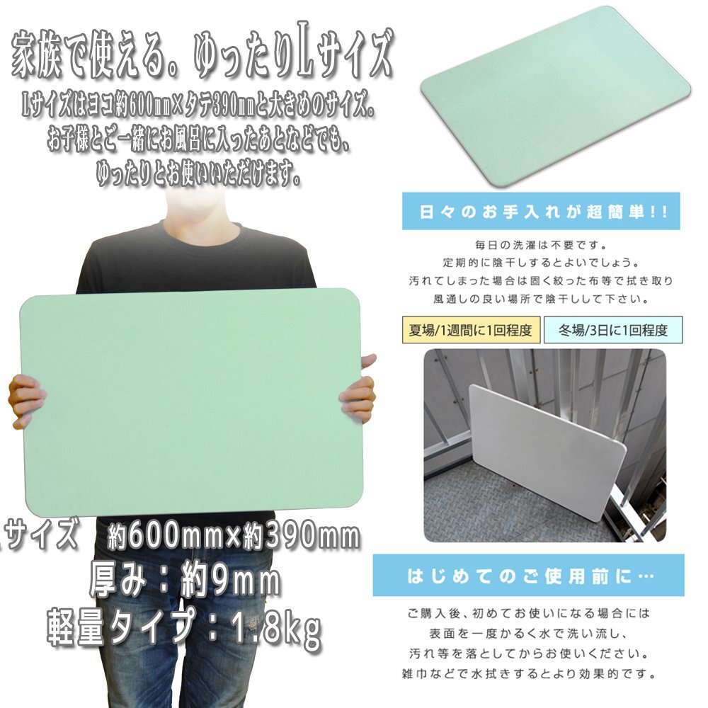 珪藻土の持つ優れた吸水性で、湯上りの濡れた足の裏の水分をすばやく吸い取ってくれます。 影干ししておくだけで、カビの発生が防げる特徴があり衛生的で手間要らず!! 軽い!薄い、丈夫!! お風呂の脱衣所や、水仕事の多いキッチンなどで大活躍です! 商品仕様 Lサイズ × 1 カラー:緑(グリーン) サイズ:(約)幅60cm×奥行39cm×高さ9mm 重量:(約)1.8kg 素材:珪藻土、植物繊維 他 |
