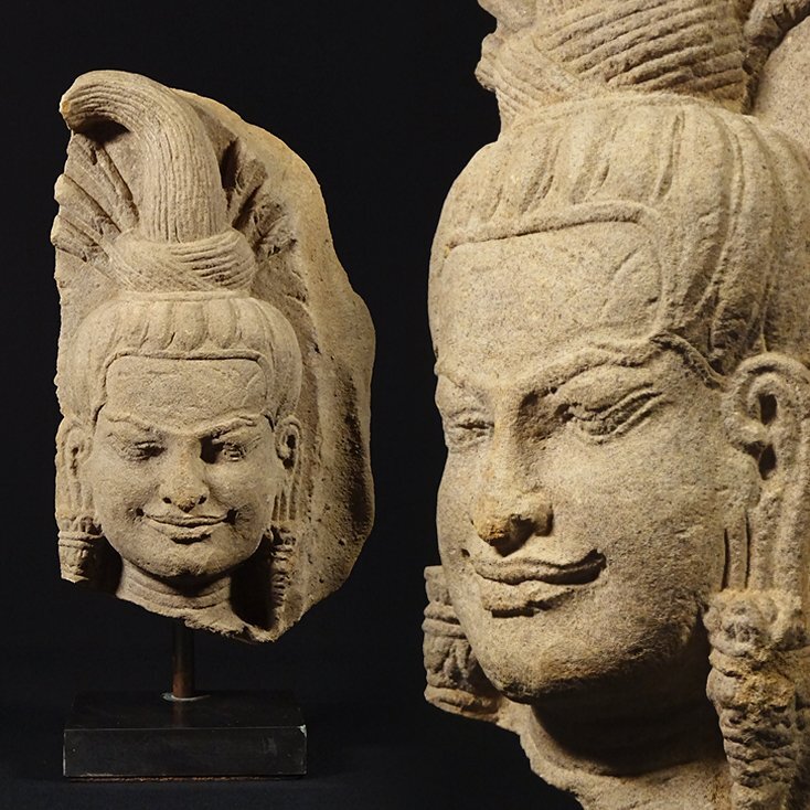 本物保証!         古代クメール美術の魅力が存分にご堪能いただける石造彫刻の貴重な一品。   石造(砂岩製)の神像頭部です。     砂岩に精緻な彫刻が施された神像の頭部で、豊かな表情を浮かべる荘厳な姿が表現されております。     長年に渡りクメール美術を蒐集されてきたコレクターの方の旧蔵品となります。         台座付。(経年による多少の傷みが生じております)         古い石造彫刻ですが、総じて目立つような傷みは無く良好な状態といえます。          正真正銘本物保証!