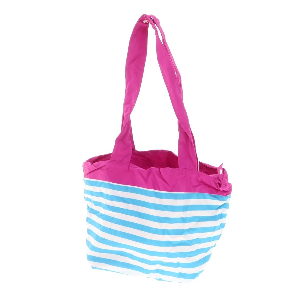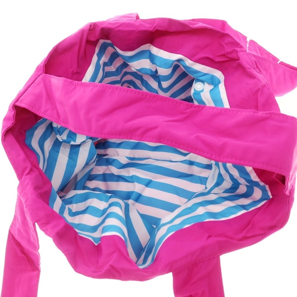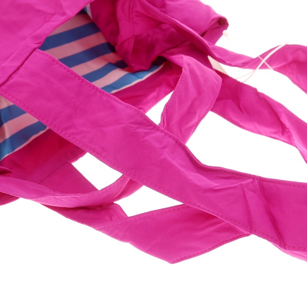 さらりとしたナイロン系素材を使用した、リバーシブルハンドバッグです。ブルー系のボーダーとピンク単色のリバーシブルになりまして、取り外し可能な外ポケットに本体を収納することも可能です。