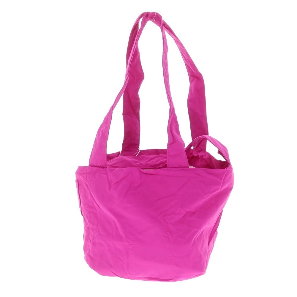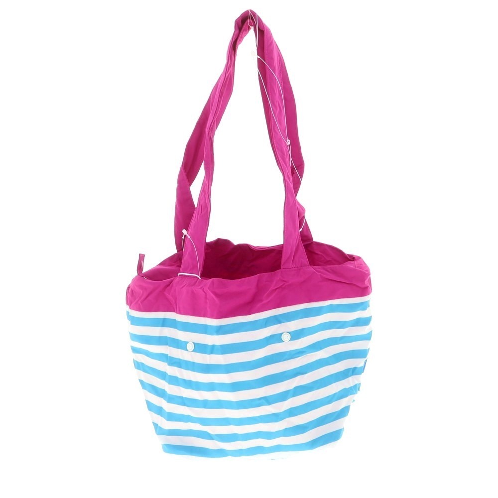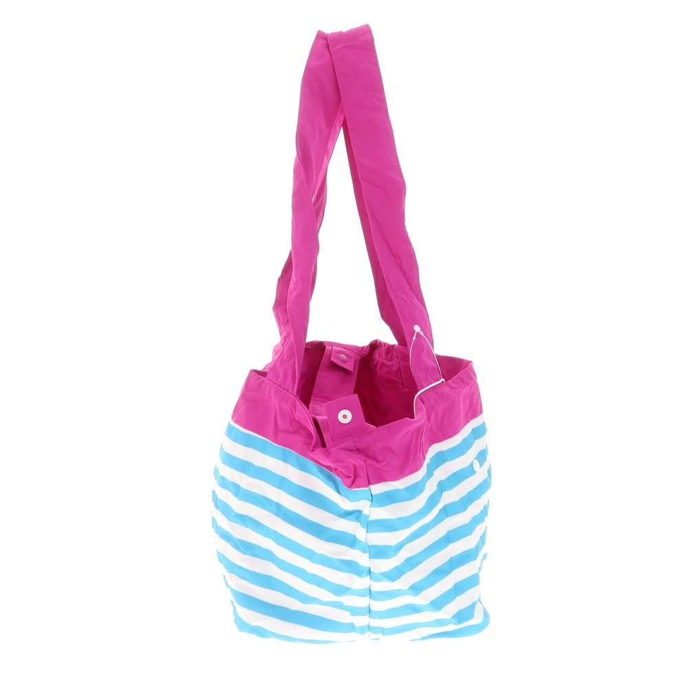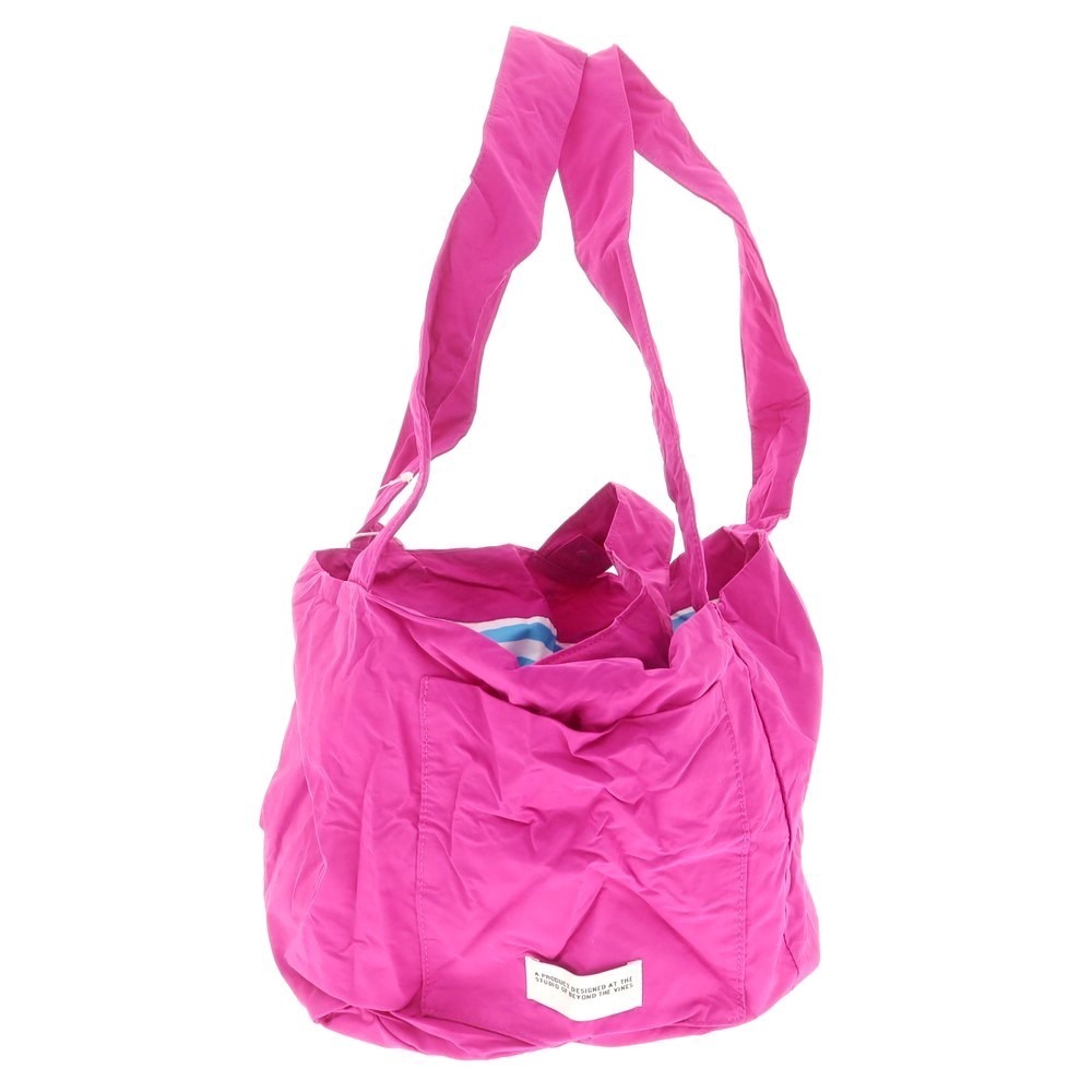 さらりとしたナイロン系素材を使用した、リバーシブルハンドバッグです。ブルー系のボーダーとピンク単色のリバーシブルになりまして、取り外し可能な外ポケットに本体を収納することも可能です。