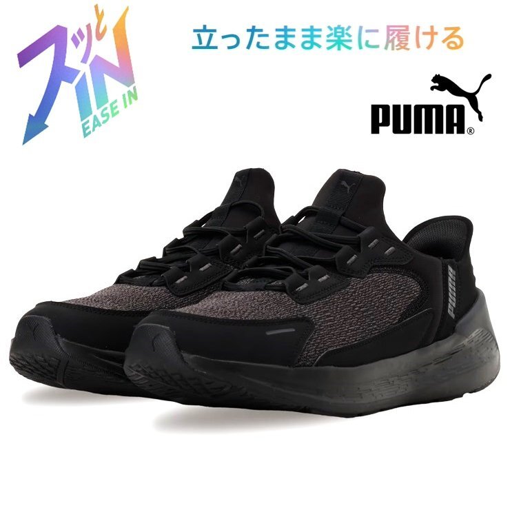プーマの「イーズイン(EASEIN)」は、スポーティなデザインと高い機能性を兼ね備えたランニングシューズ。SOFTRIDE シンメトリーをベースに、立ったままでも簡単に履けるスリッポン構造を採用し、忙しい日常でもストレスフリーな着脱を実現します。ミッドソールには、優れたクッション性を誇るPUMA SOFTRIDE FOAMを搭載。厚めのソール設計が足への衝撃をしっかり吸収し、長時間のランニングやウォーキングでも快適な履き心地が持続します。アッパーには、軽量で通気性に優れたヘザールックのメッシュ素材を使用。柔らかく足にフィットし、軽やかなステップをサポートします。エラスティックシューレース仕様で、見た目はスポーティに、履き心地はイージーに。プーマキャットロゴがアクセントとなり、スタイリッシュな印象を演出します。 |