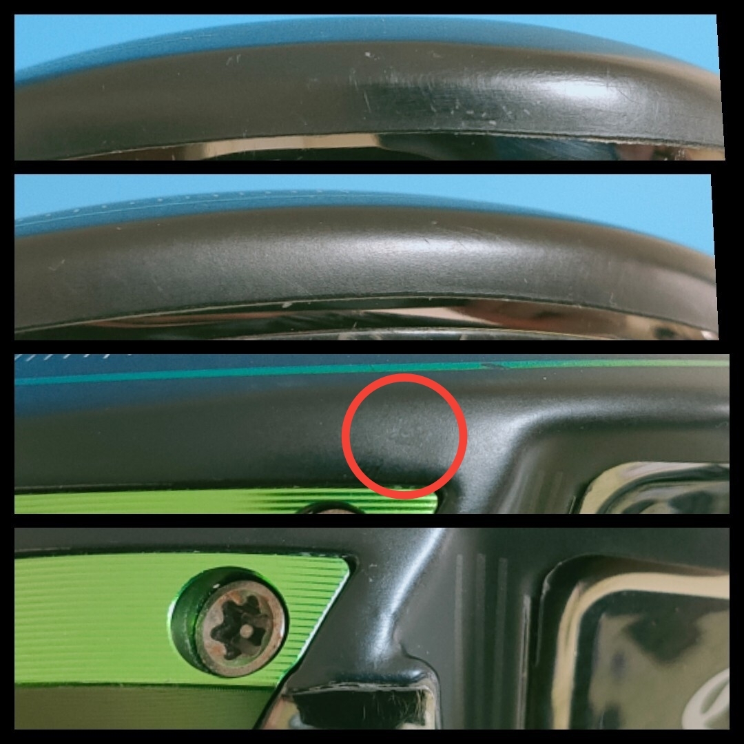 写真7のとおりクリア傷、小さな当たり傷、緑ライン部分の塗装欠け等の細かい傷はありますが、状態は悪くないと思います。