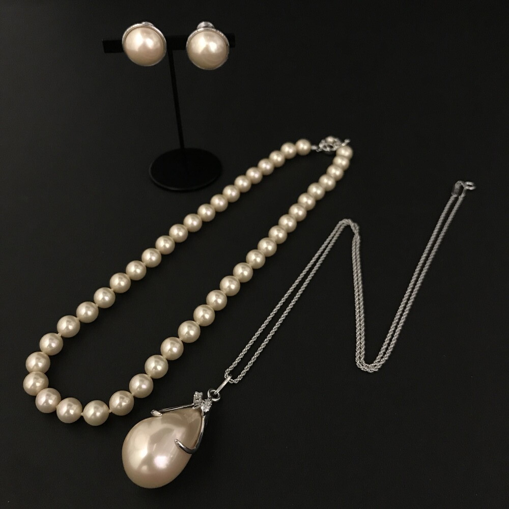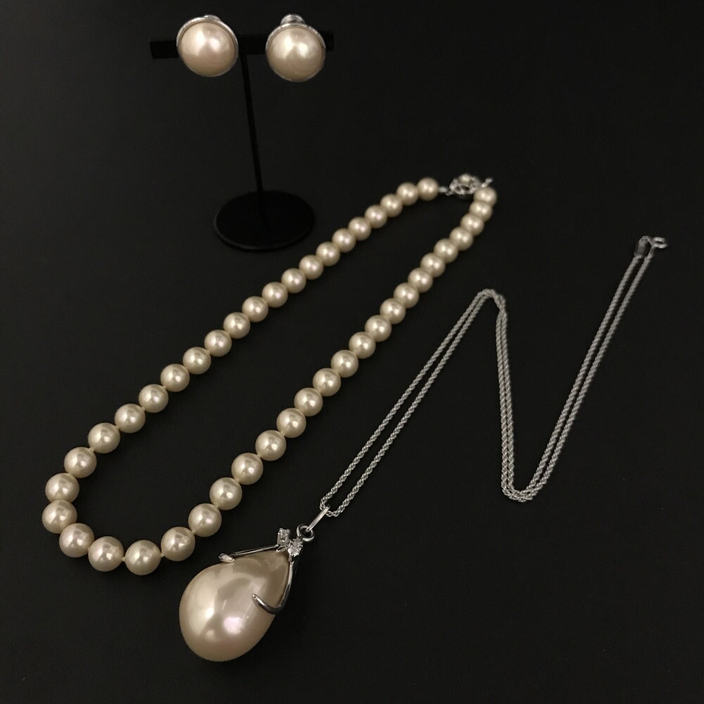 1円 極美品 MAJORICA マジョルカ フェイクパール 真珠 ラインストーン ネックレス イヤリング アクセサリー 3点セット ホワイト /ZX0620