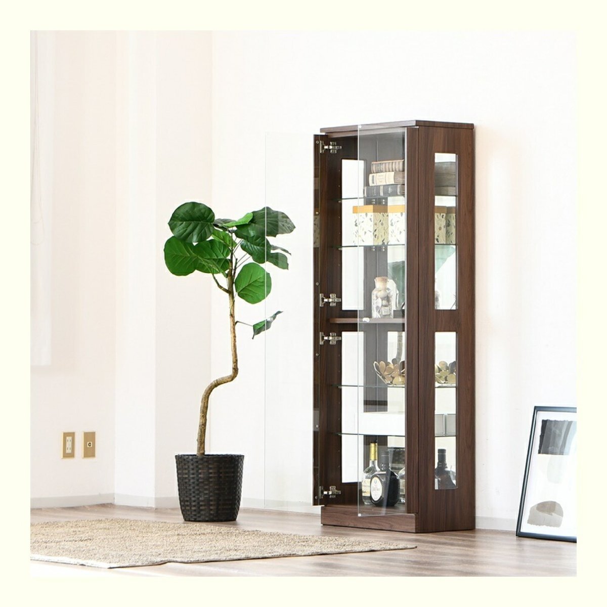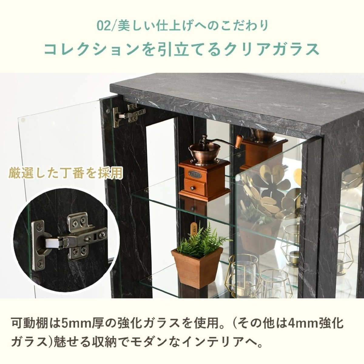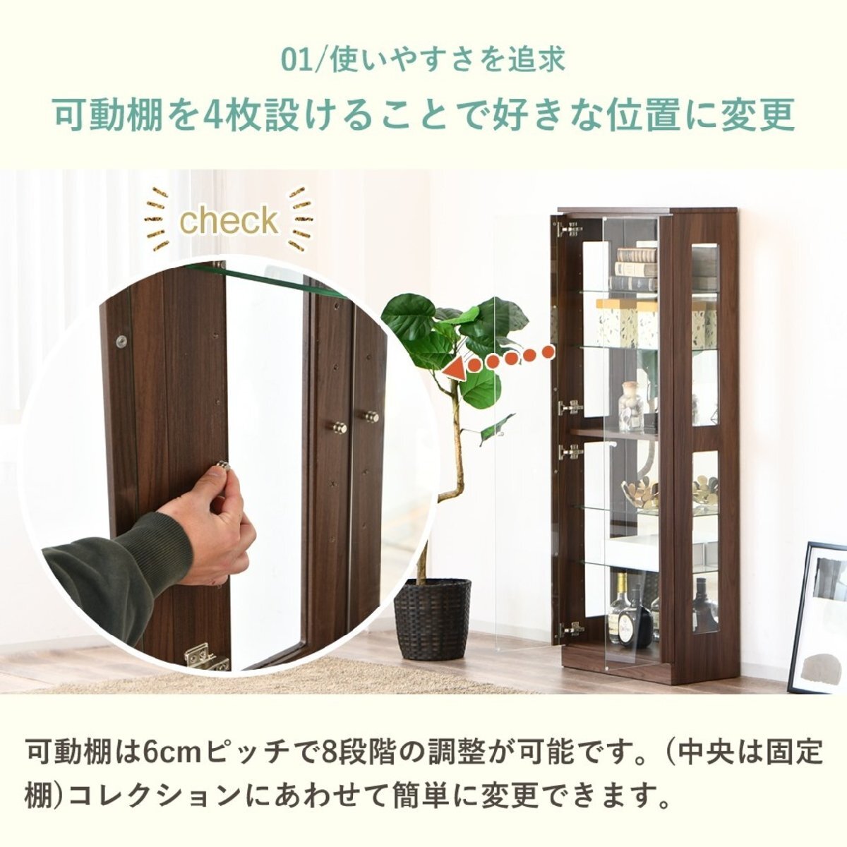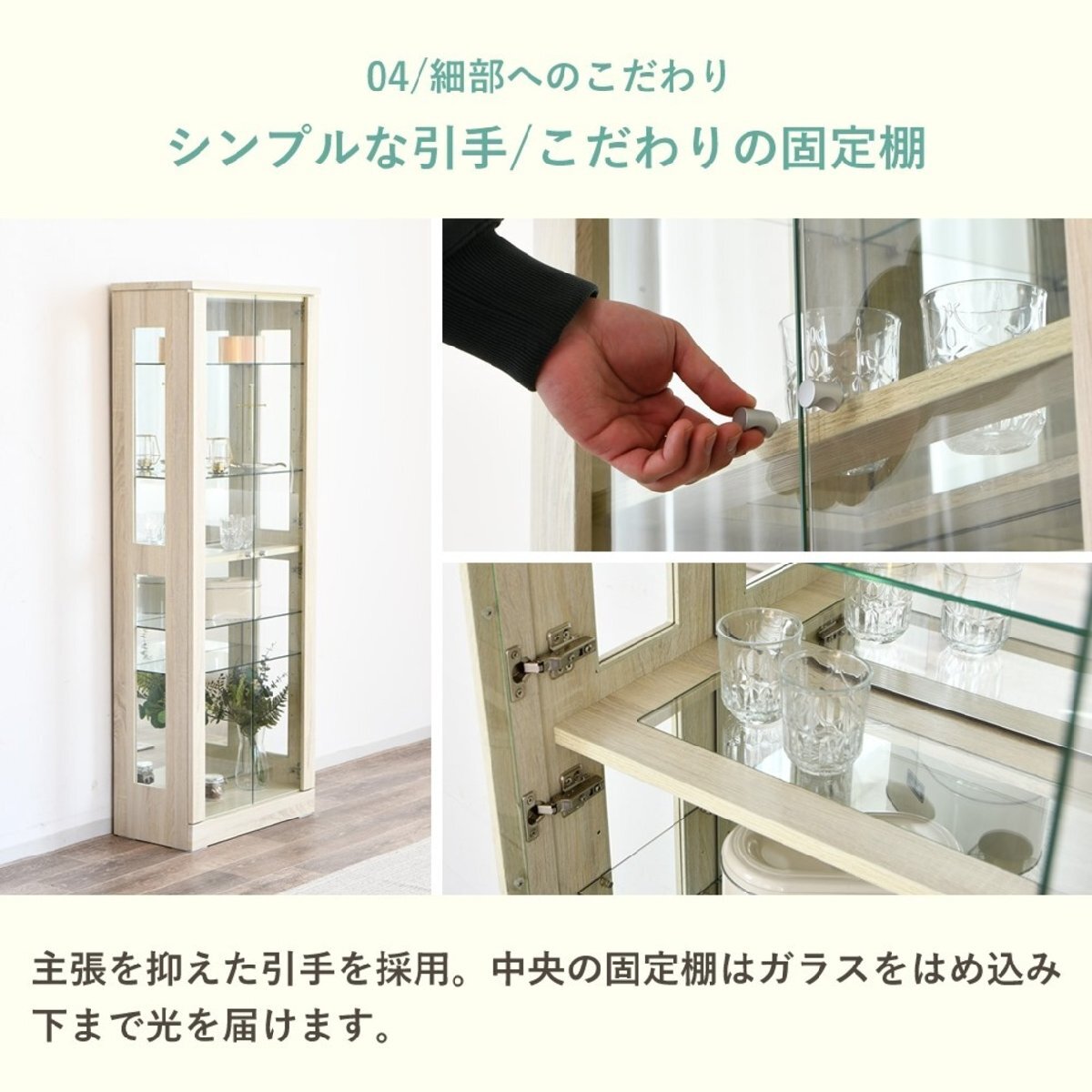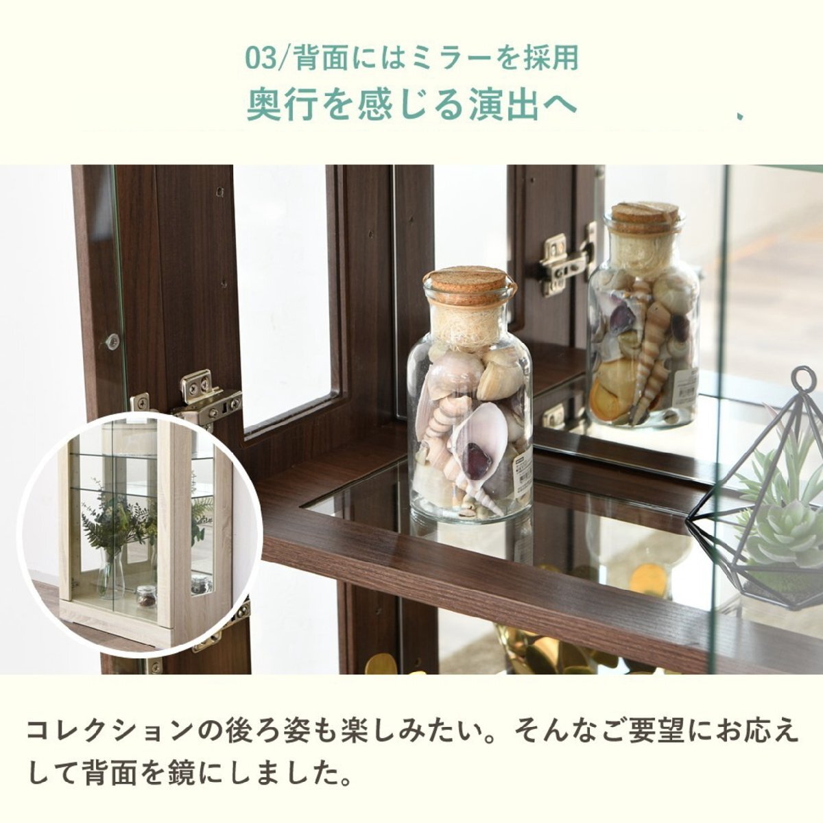 特  徴可動棚が4枚付きなので好きな位置に変更可能、背面に使用しているミラーが奥行のある空間を演出します。