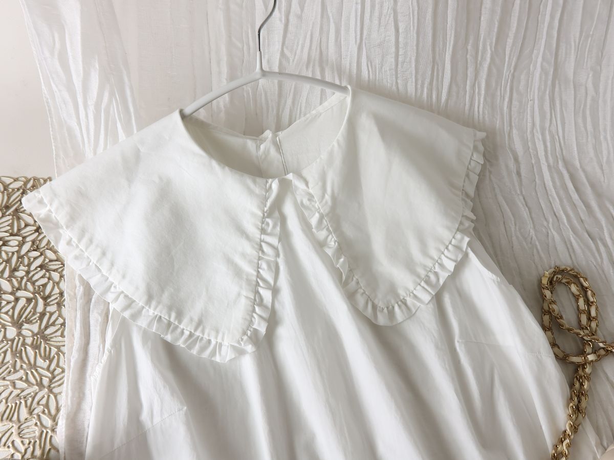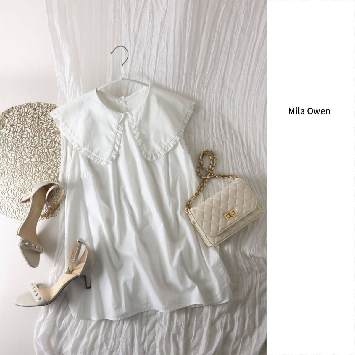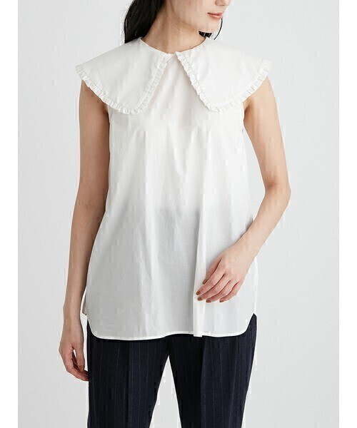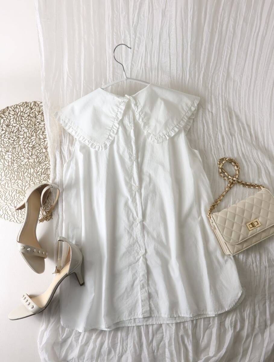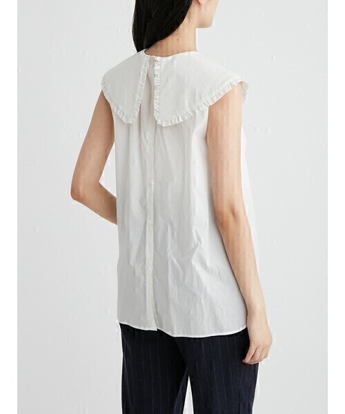 大きめ襟をトリミングするフリルが特徴。ノースリーブなので1枚でブラウスとして着るのもちろん、インナーとしてレイヤードも楽しめるのでシーズンを通して活躍するアイテムです。裾はシャツカーブに仕上げレイヤードした時も大人な印象に。後ろにボタン、フロントにはボタンがなくシンプルなのでジャケットやカーデとのコーディネートもおすすめです。