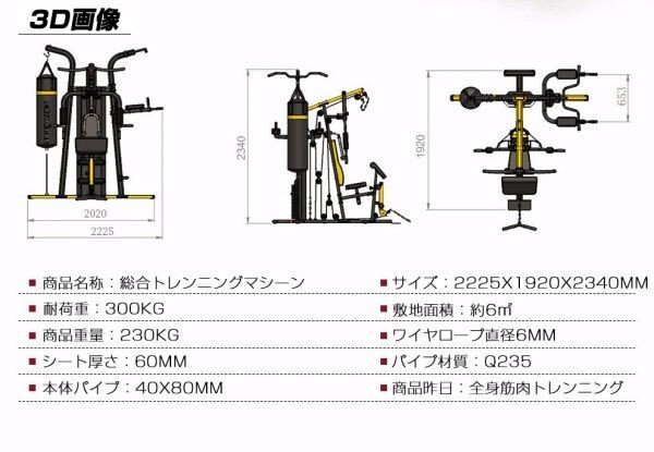 ------------------------------------------- ▲サイズ:2283mm * 2110mm * 2349mm ▲耐荷重:400kg ▲敷地面積:約5㎡ ▲合計重量:230kg(25KGサンドバッグを含め) ▲5つの付属品を増加。色な運動ができる。 ▲全身筋肉運動にピッタリ! ▲家庭ジムになり、家族全員が使える。同時に3人が運動できる。 【特徴】 ------------------------ ◆50x75mmパイプを採用し、安定力UP! ◆サンドバック全体は上質なPUレザーを使って、裂けにくくなる! ◆仰臥板は独立し、もっと安定になり、移動可能になる! ◆サビ防止のカウントウエイトは合計13枚で、合計73KG! 【発送について】当商品が他社代理出荷でございます。直接取り受けはできません。 また、当商品は6箱に分けて発送します。お手元に届きましたら、お手数ですが、箱数確認お願いします。 |
