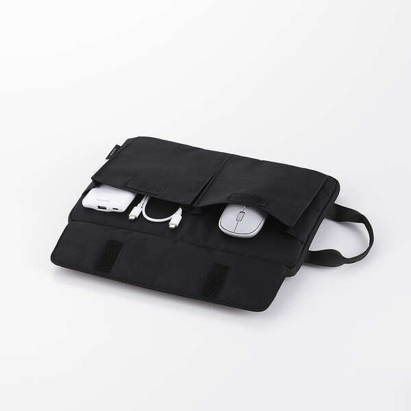 | ●ケース前面には、用途に応じて使い分けできる2つの仕分けポケットがあり、 マチ付きでマウスなど厚みがある小物の収納に便利です | |