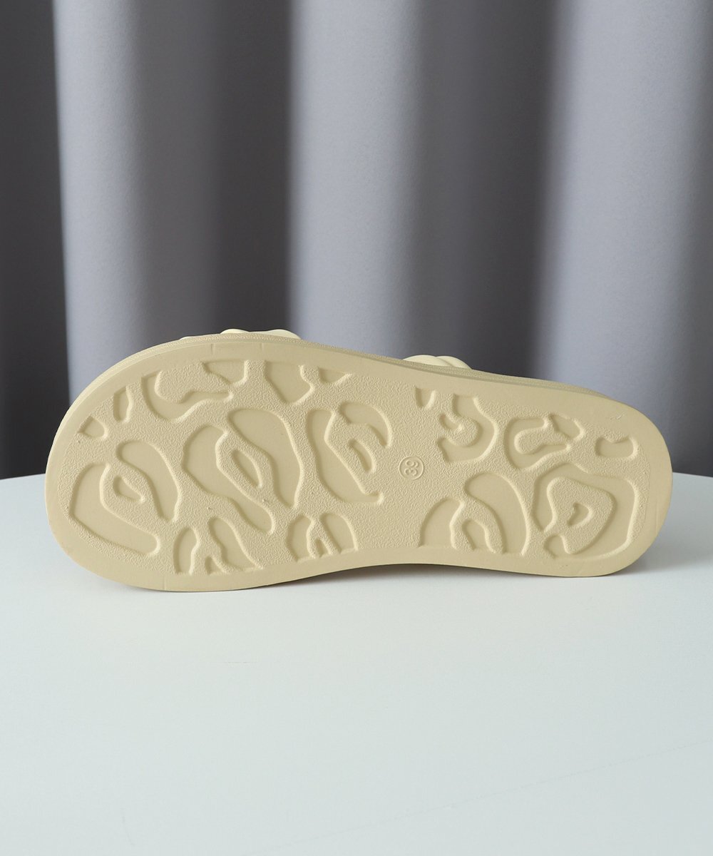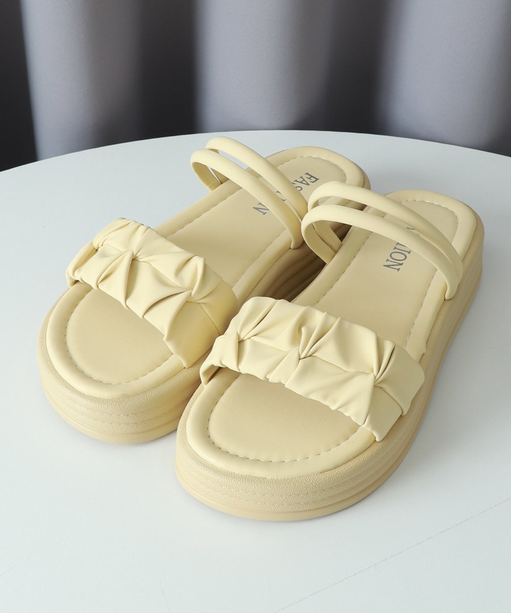 ギャザーデザインのベルトがポイントのサマーミュールサンダル。