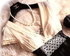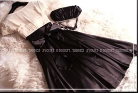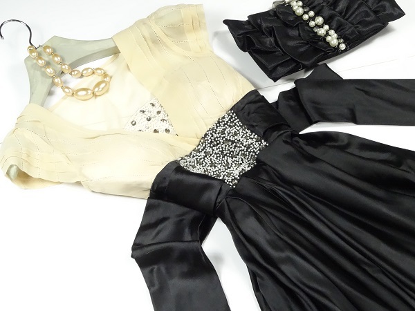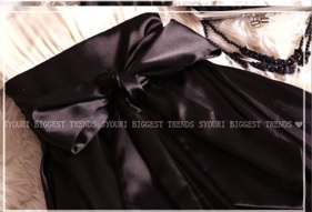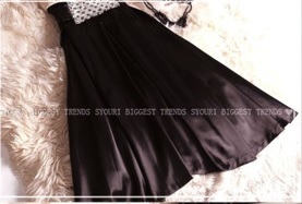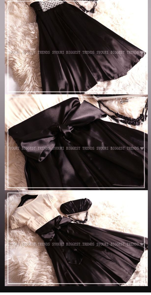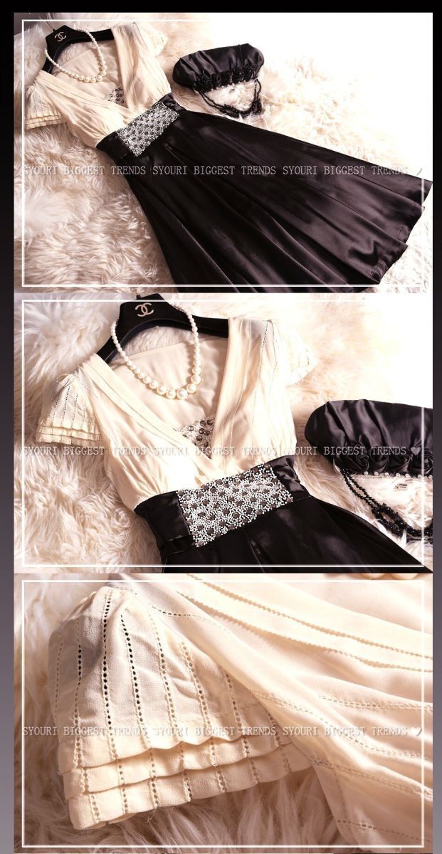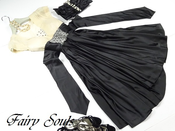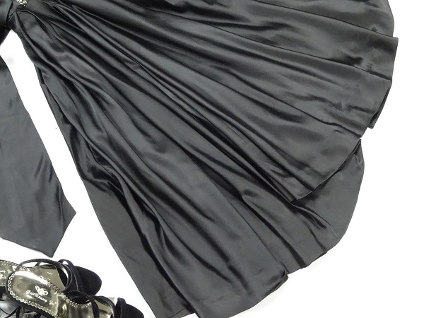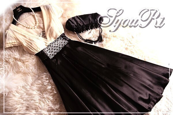 ウエストビジュー飾りのひざ下丈ドレスワンピースです。トップス部分はやわらかなドットの透かし彫りが入った上品なベージュシフォン地に、V字の胸の間はビーズとラインストーンをたっぷり使用しています。幅広ウエストには中央に大きなビーズとラインストーンをあしらい、大きな幅広リボンと合わせて、スカート部分の黒の色合いに華やかさをプラスしています。スカート部分はつややかなサテン生地をたっぷりと使用しボリューム感を出しています。上品で豪華な一着です。ウエストリボンは左右の脇で縫い付けており取り外し不可。左脇下ファスナー。裏地付。
