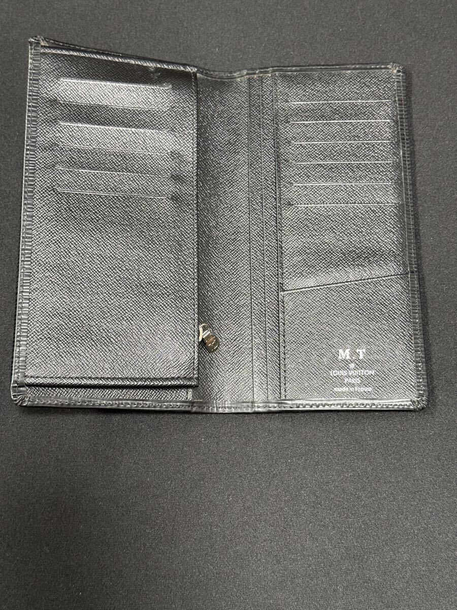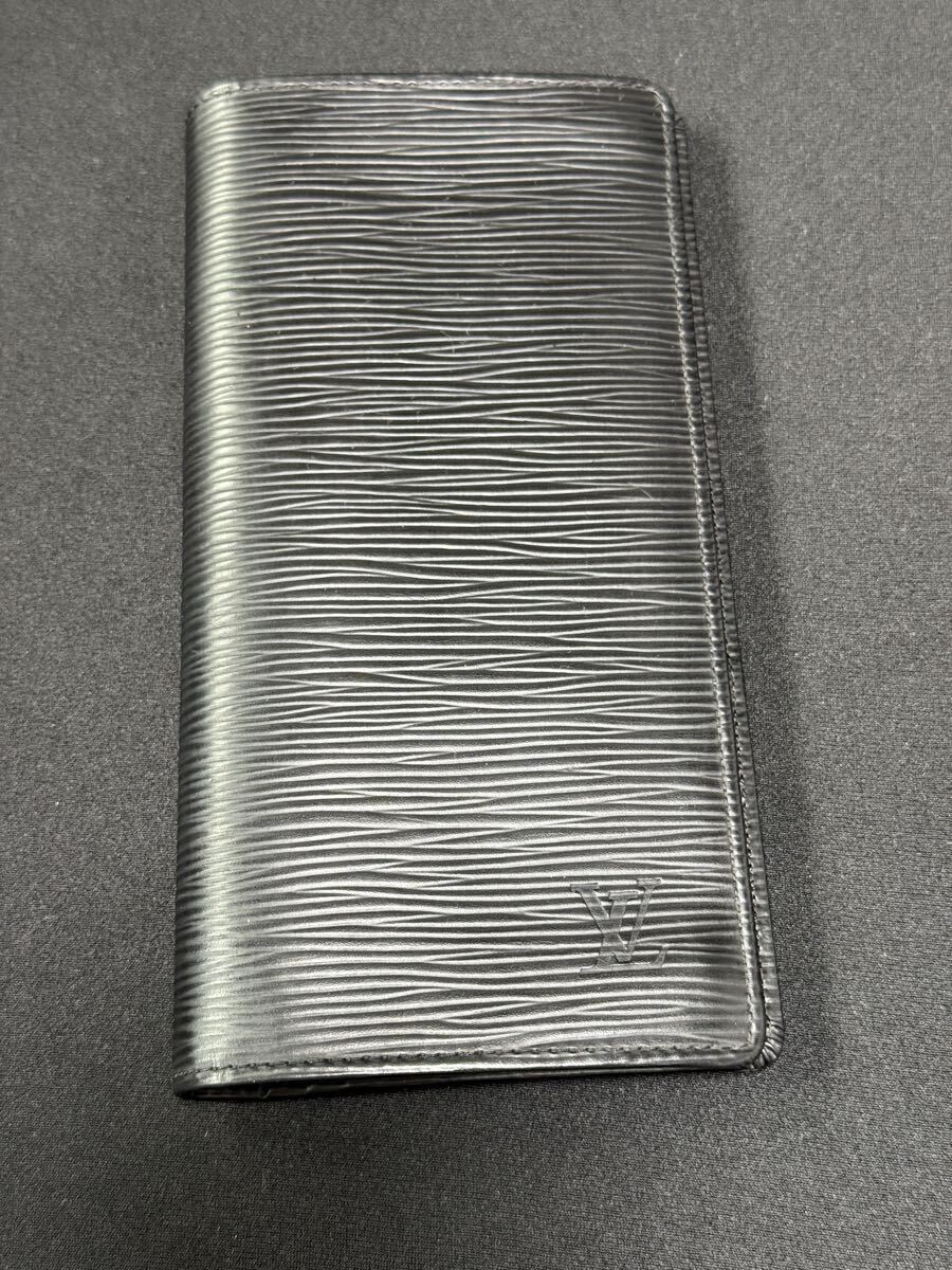 エピレザー製のブラック長財布、カードポケット多数付き。
