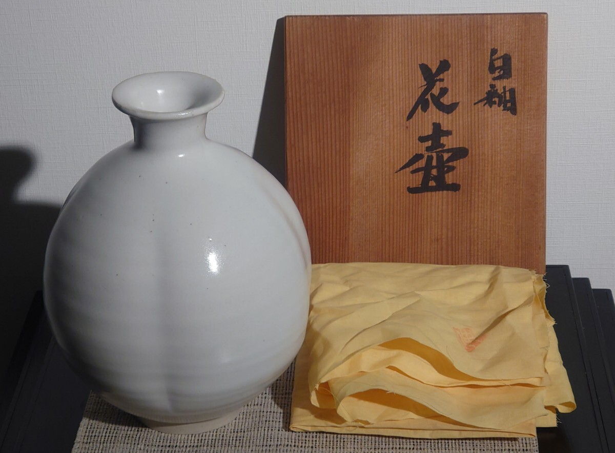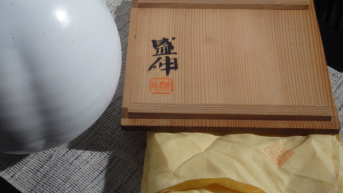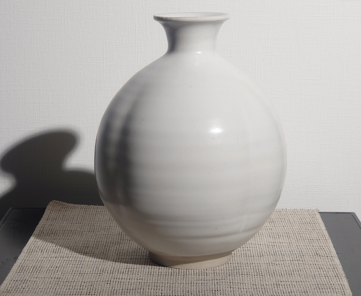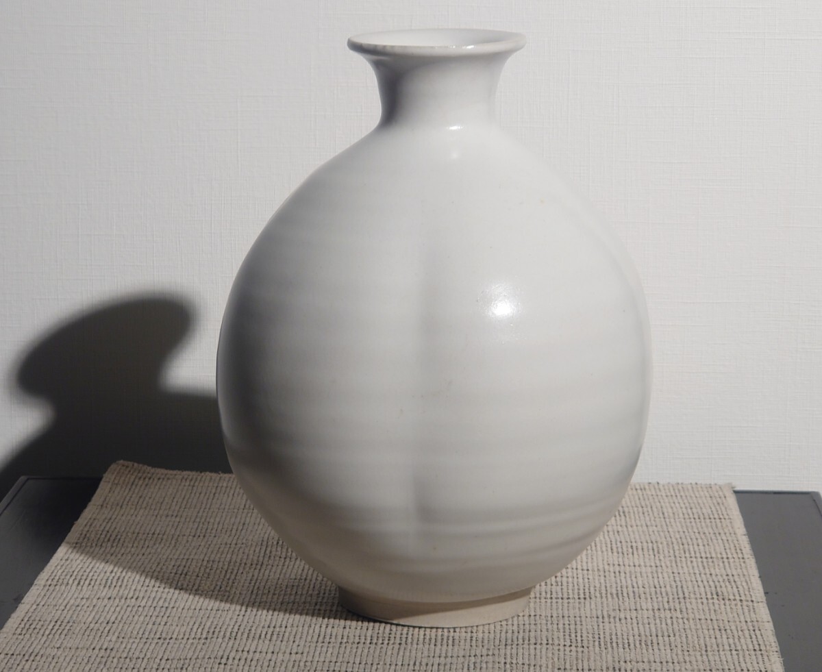京都の陶芸作家、木村盛伸氏(1932-)の白釉花瓶になります。日本伝統工芸展等の数々の公募展への入選歴のある作家となります。白釉の柔らかな色味、釉薬の上から分かるロクロ目と成形跡により手作業の仕事が見て取れる温かみのある作品かと思います。