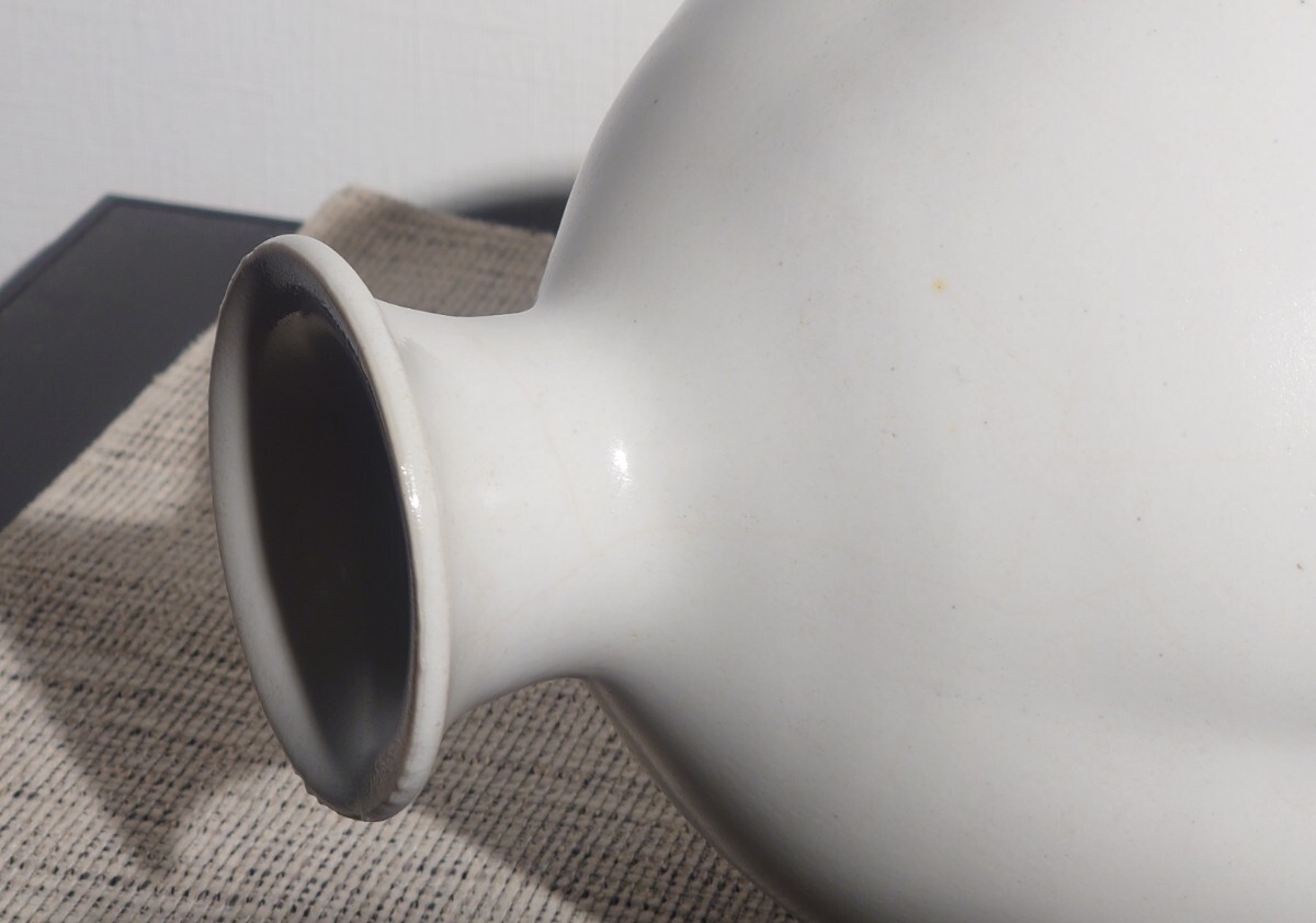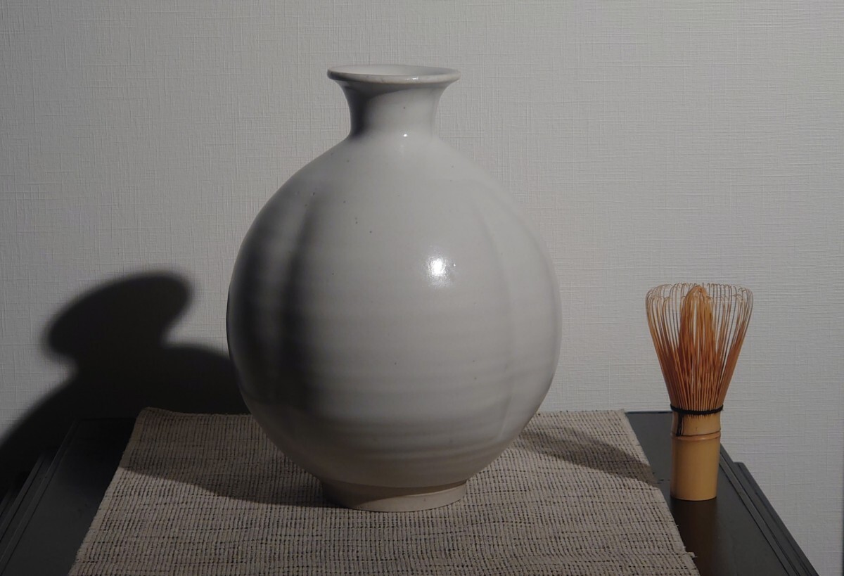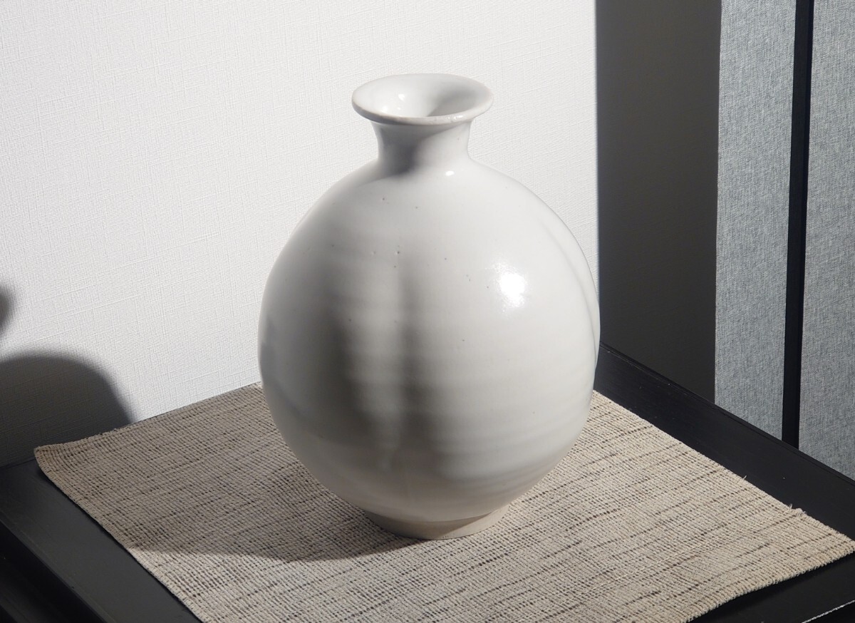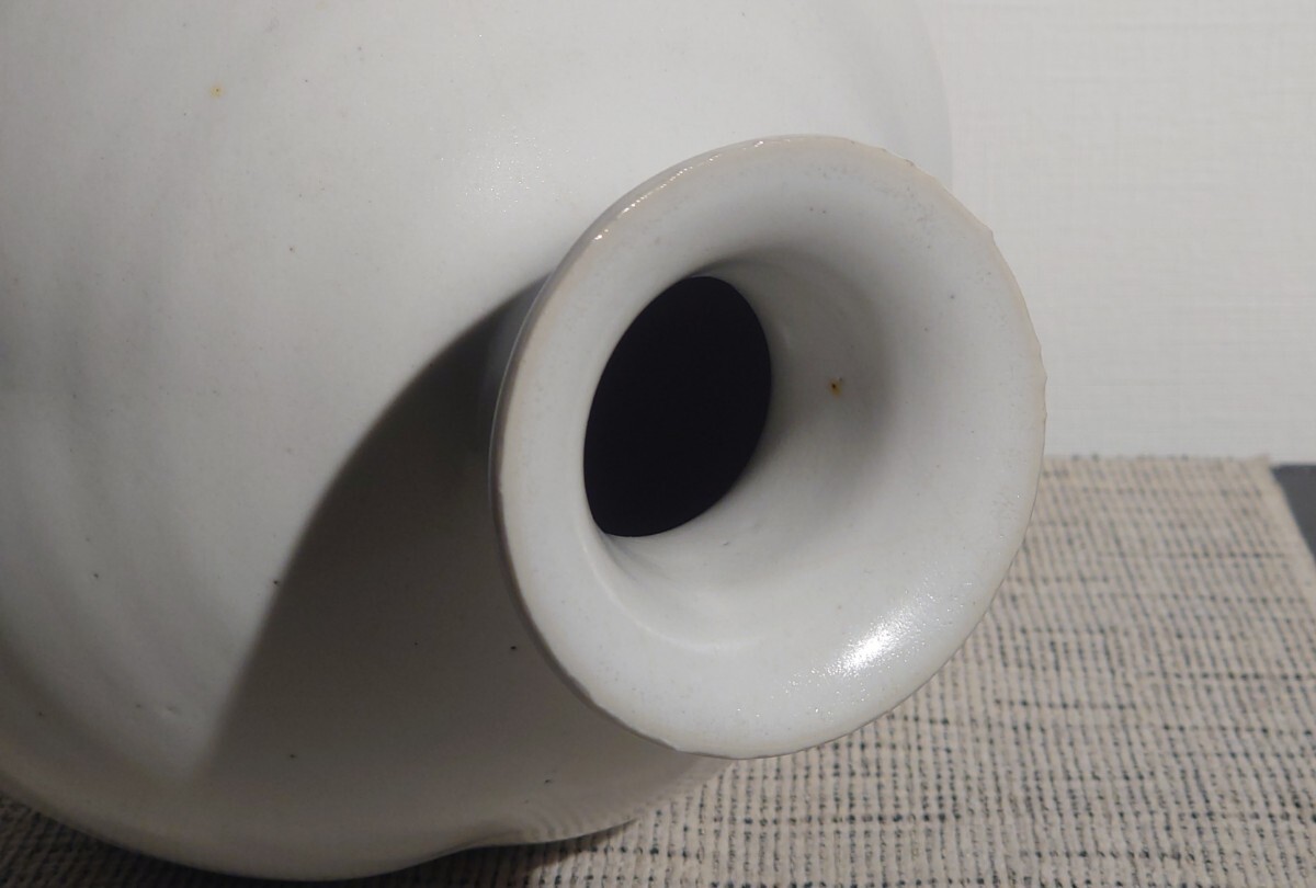 京都の陶芸作家、木村盛伸氏(1932-)の白釉花瓶になります。日本伝統工芸展等の数々の公募展への入選歴のある作家となります。白釉の柔らかな色味、釉薬の上から分かるロクロ目と成形跡により手作業の仕事が見て取れる温かみのある作品かと思います。