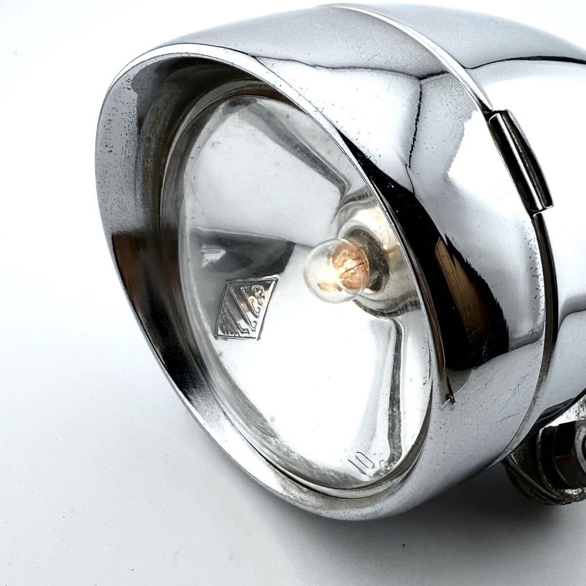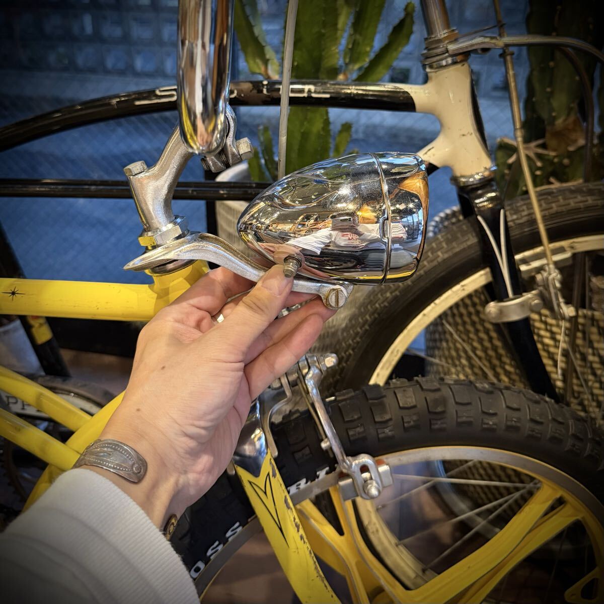 ボリューム感のある美しい砲弾型、ガラスレンズとベゼルにMILLERロゴ、シェルのトップにはダイアモンドシェイプのアクセントが入り、シュウィン他ビンテージ自転車向けに人気のライトです。