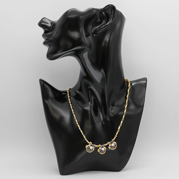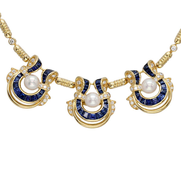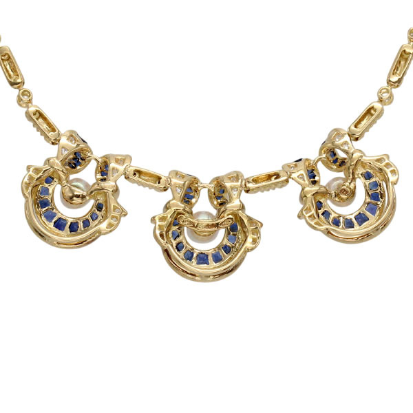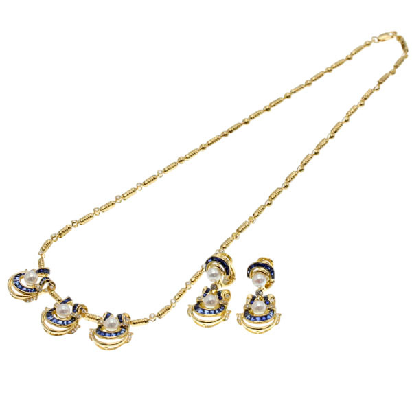 こちらの商品はイエローゴールドに深いブルーが印象的なサファイアと繊細に煌めくダイヤモンド、柔らかな光を放つパールをあしらったネックレスとイヤリングの2点セットです。