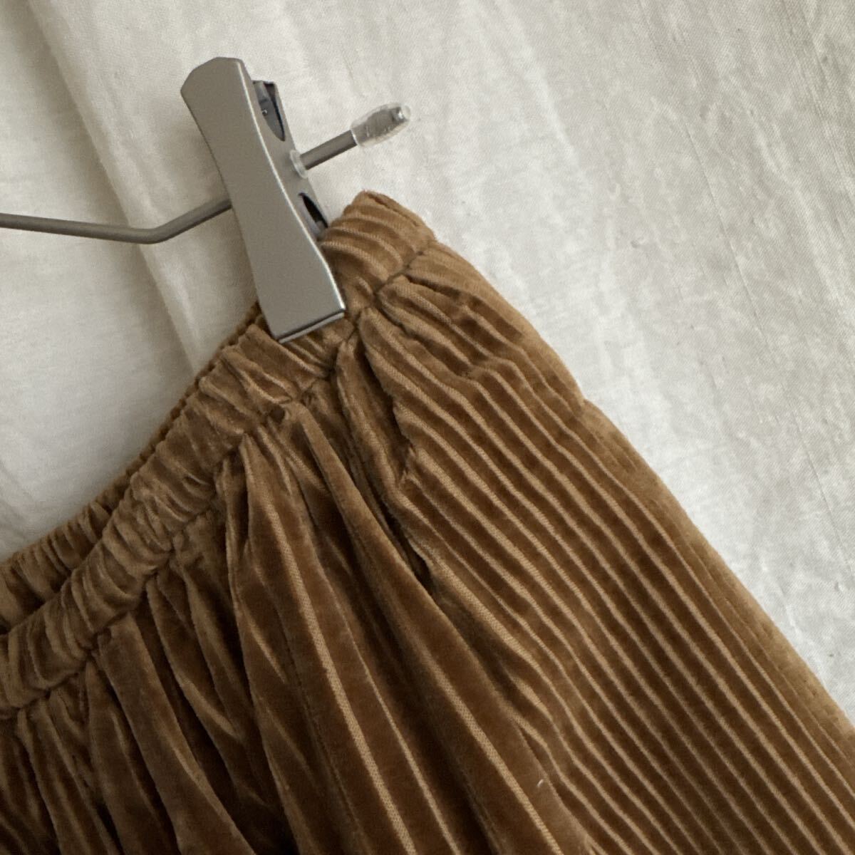 ウエストラインにゴムが通ったイージータイプで、ウエスト周りにギャザーが施されており、左右ウエストにシームポケットがあり、ダークブラウンの裏地付きです。