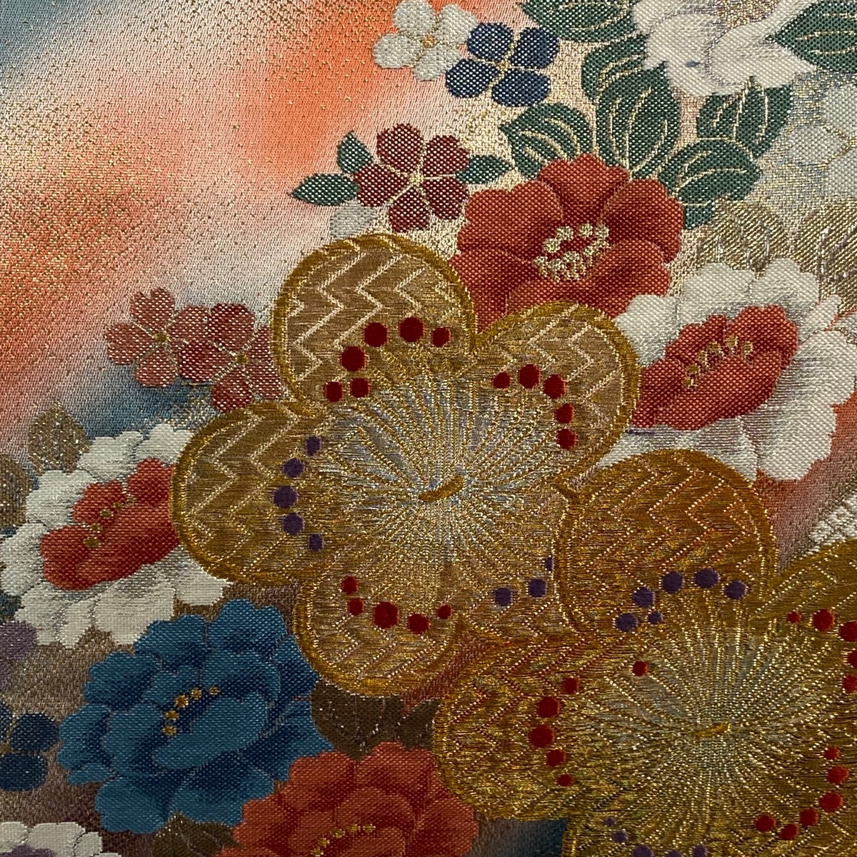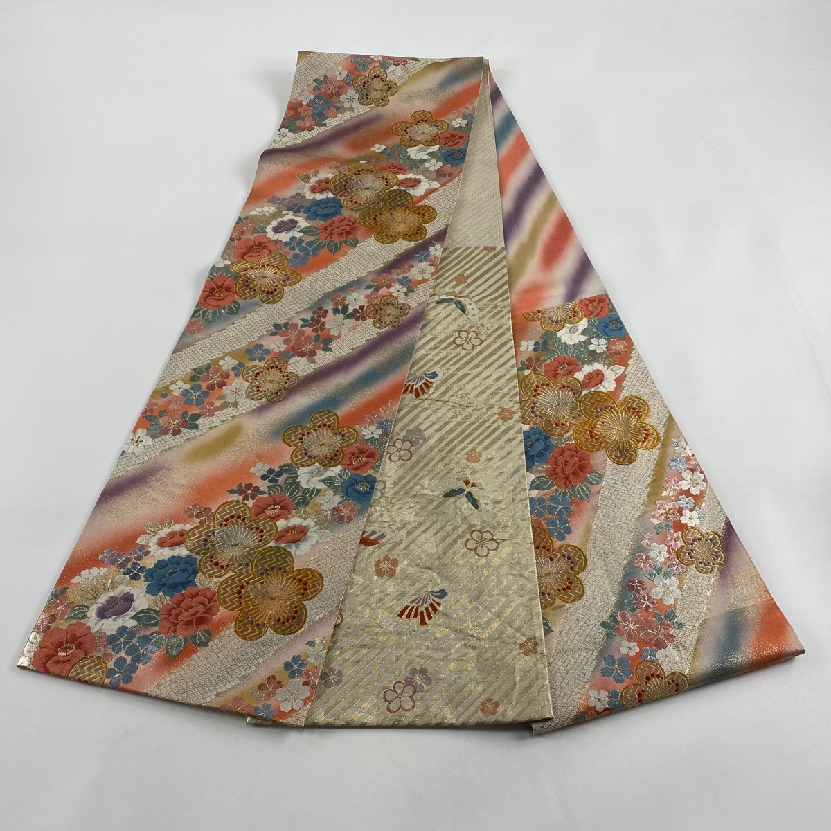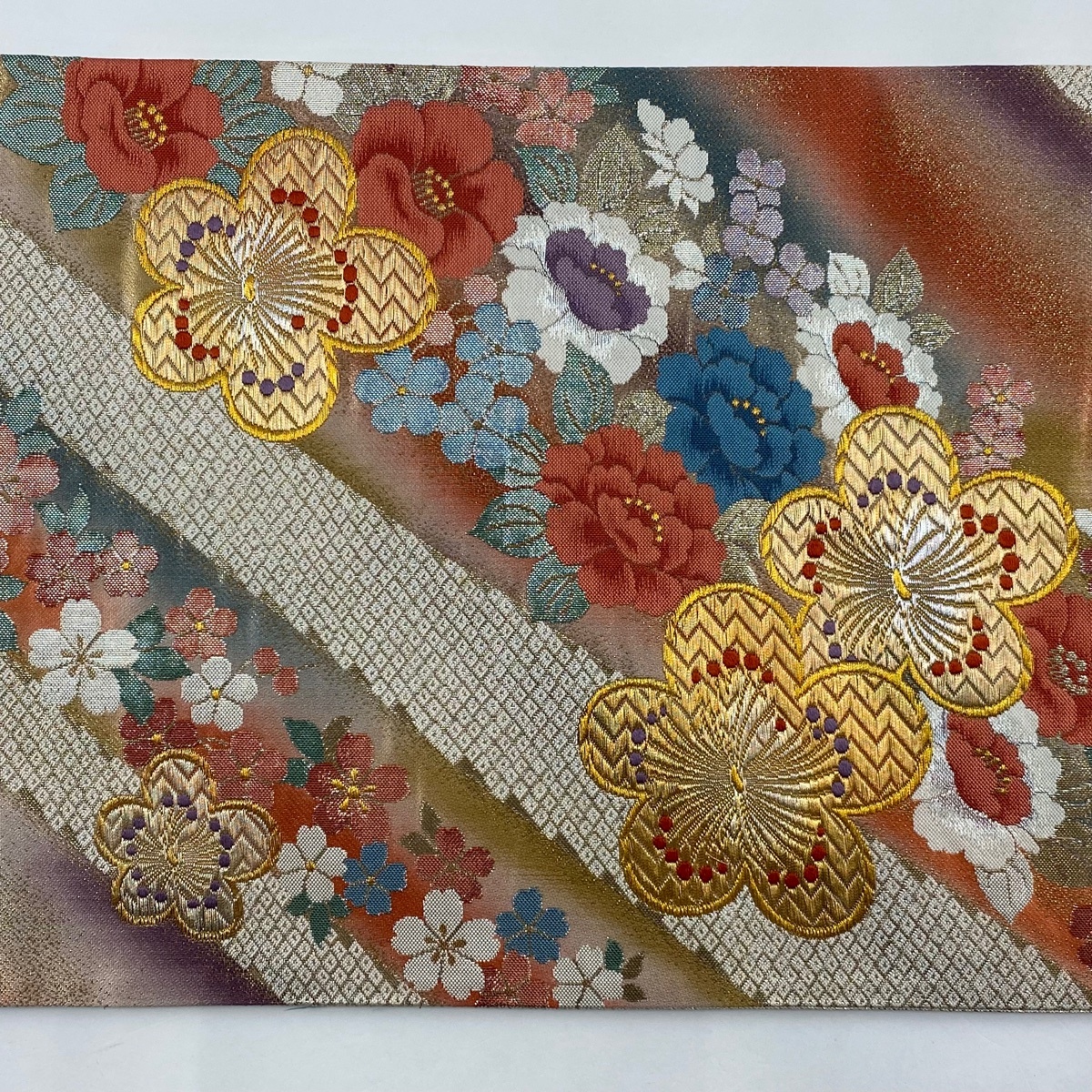 | 袋帯 秀品 草花 斜縞 金糸 箔 朱色 六通 正絹 【中古】 |