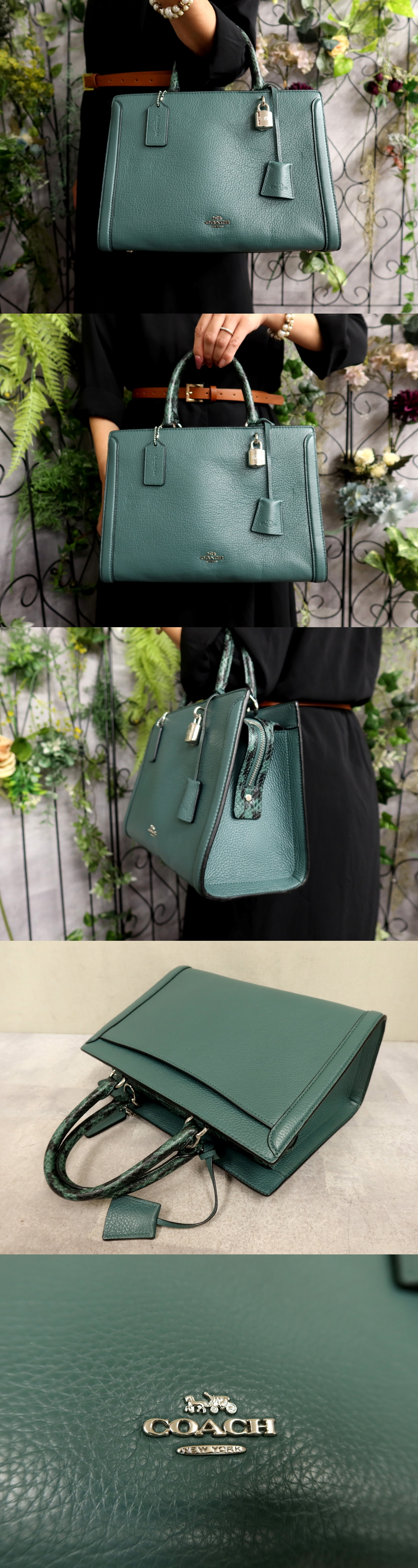 超美品●新品同様●コーチ●ゾーイキャリーオール●91036●パイソン 型押し カーフ レザー 本革●ハンド バッグ●ブルーグリーン●Js60813
