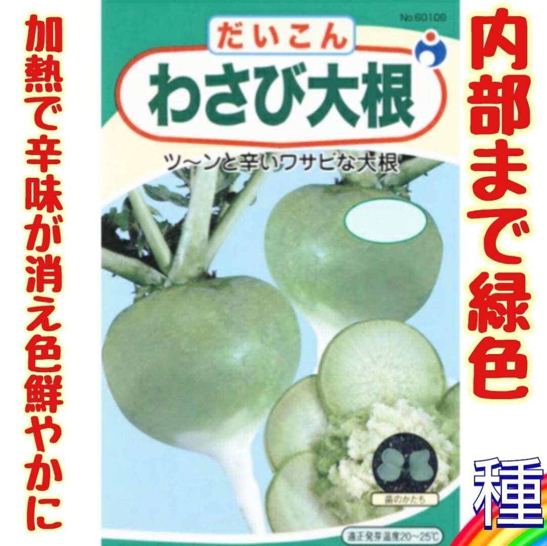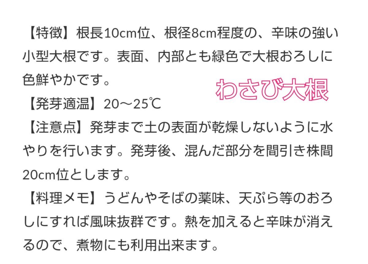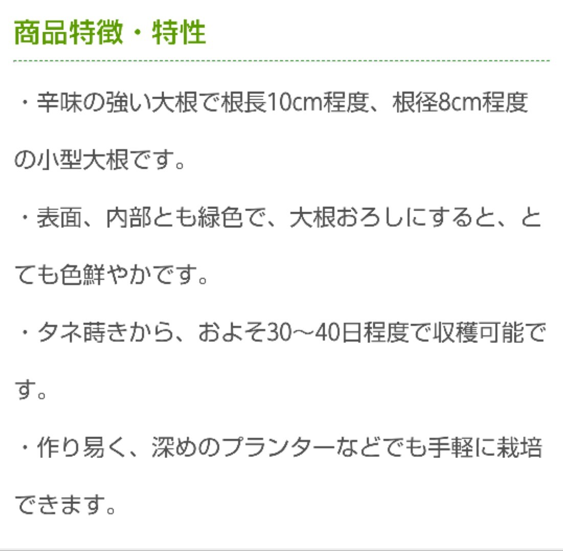根長10cm位、根径8cm程度の、辛味の強い小型大根です。表面、内部とも緑色で大根おろしに色鮮やかです。