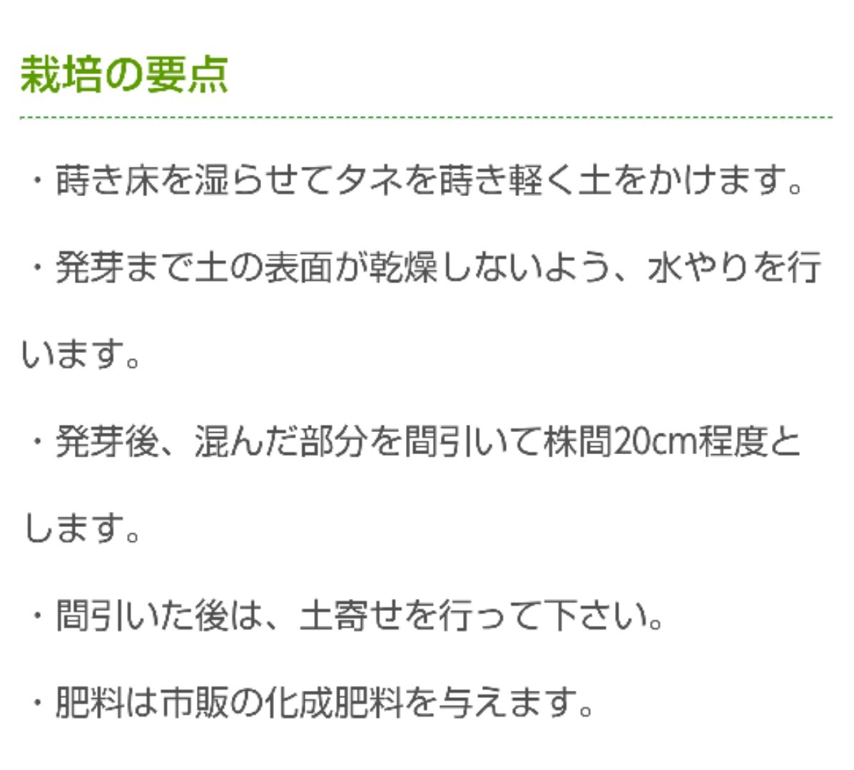 【注意点】発芽まで土の表面が乾燥しないように水やりを行います。発芽後、混んだ部分を間引き株間20cm位とします。