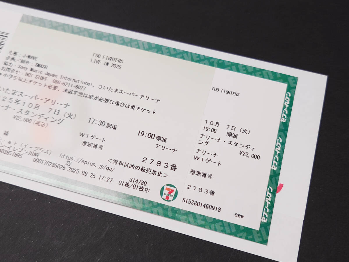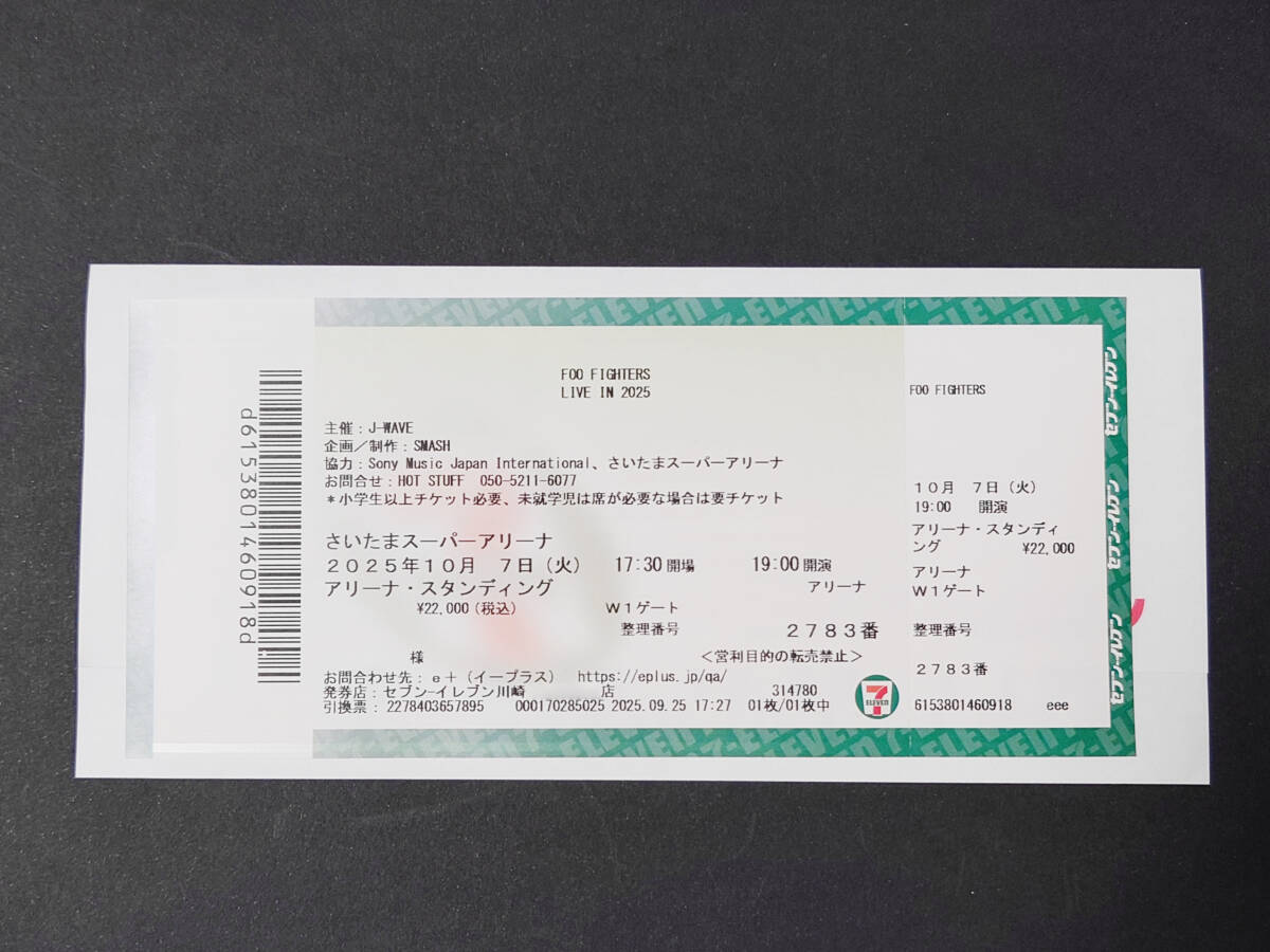 2025年10月7日(火)、さいたまスーパーアリーナでのFoo Fighters公演のチケットです。アリーナスタンディングのチケットとなります。