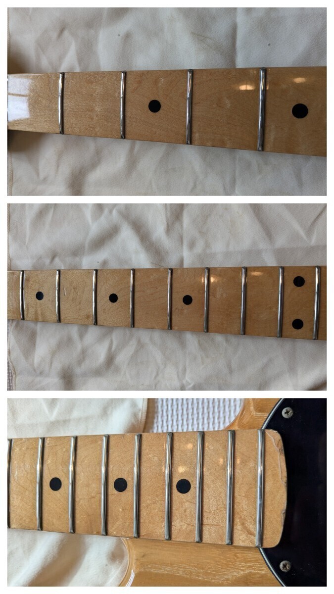 フレットは7割程度?残っています。ローフレットに弦の跡がありますが、上記の現状の設定で音づまりなく使えます。