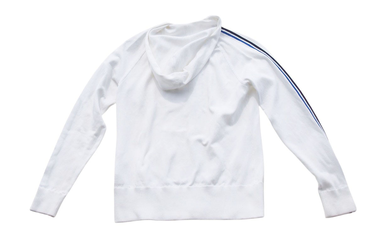 コットンニットのやわらかさと、フード付きの安心感。肌寒い日のラウンドに頼れる一枚。 — 袖のラインが映える、品のあるスポーティスタイル。