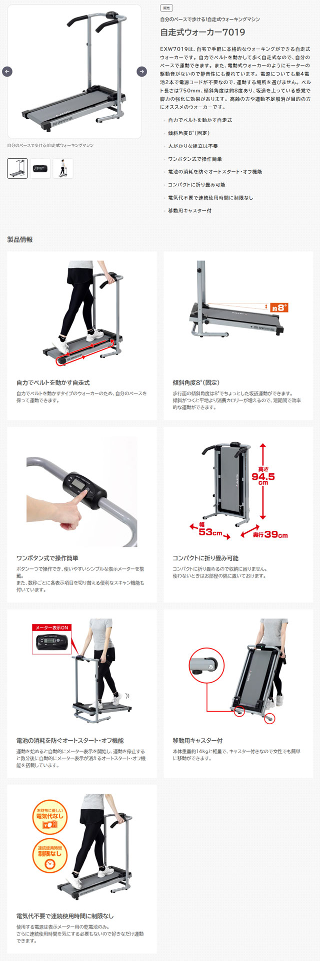 アルインコ 自走式ウォーキングマシン 自走式ウォーカー7019 EXW7019 を出品いたします。 ■特徴■ 自分のペースで歩ける! 自走式ウォーキングマシン 自力でベルトを動かす自走式 自力でベルトを動かすタイプのウォーカーのため、 自分のペースを保って運動できます。 傾斜角度8°(固定) 歩行面の傾斜角度は8°で ちょっとした坂道運動ができます。 傾斜がつくと平地より消費カロリーが増えるので、 短期間で効率的な運動ができます。 ワンボタン式で操作簡単 ボタン一つで操作でき、 使いやすいシンプルな表示メーターを搭載。 また、数秒ごとに各表示項目を切り替える 便利なスキャン機能も付いています。 コンパクトに折り畳み可能 コンパクトに折り畳めるので収納に困りません。 使わないときはお部屋の隅に置いておけます。 電池の消耗を防ぐオートスタート・オフ機能 運動を始めると自動的にメーター表示を開始し、 運動を停止すると数分後に 自動的にメーター表示が消える オートスタート・オフ機能を搭載しています。 移動用キャスター付 本体重量約14kgと軽量で、 キャスター付きなので 女性でも簡単に移動ができます。 電気代不要で連続使用時間に制限なし 使用する電源は表示メーター用の乾電池のみ。 さらに連続使用時間を気にする必要もないので 好きなだけ運動できます。 ■仕様■