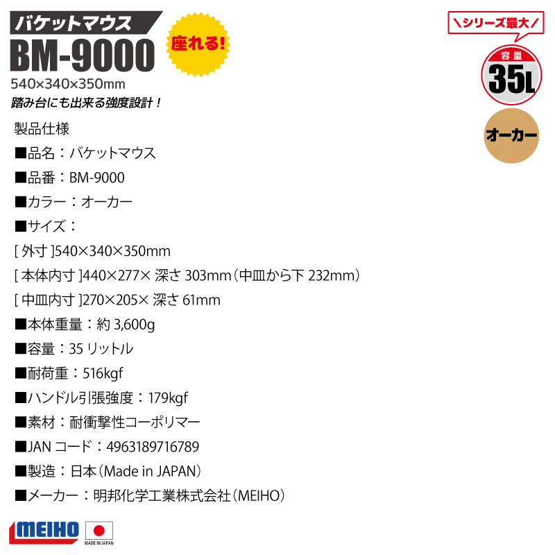 | 商品名 | メイホウ バケットマウス BM-9000 オーカー 釣り MEIHO 540×340×350mm 35L 釣り用 収納 ハードボックス | ||||||||||