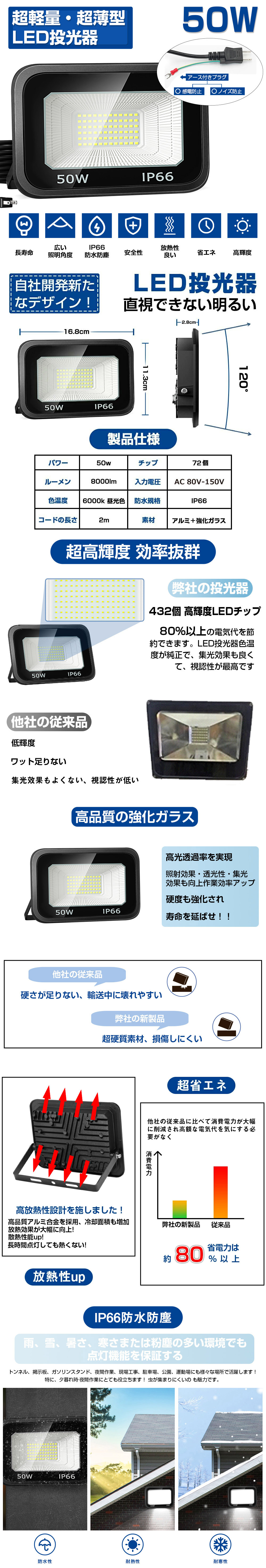 超高輝度LED投光器、全72個チップのデザインを採用して、定格光束8000lmに達します。強化ガラスを採用して、高輝度昼光色を生成できます、高光透過率を実現させました。照射効果、透光性と耐震性も向上します、反射效率アップ!120°の照明角度ができますので、広い範囲に照射可能になり、屋外と部屋の隅々をより効率的に照らすことができます。