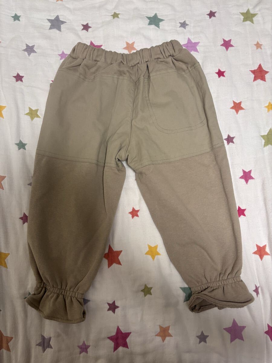 膝とお尻に当て布があり頑丈で、保育園用のお洋服として最適です。