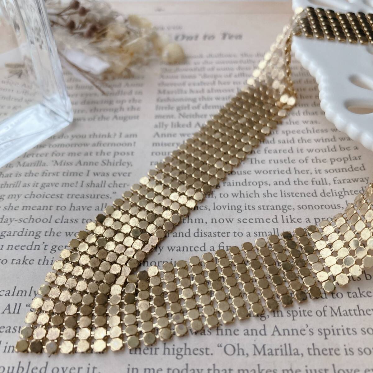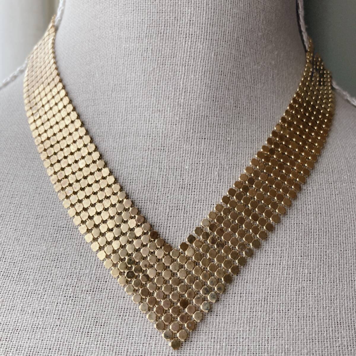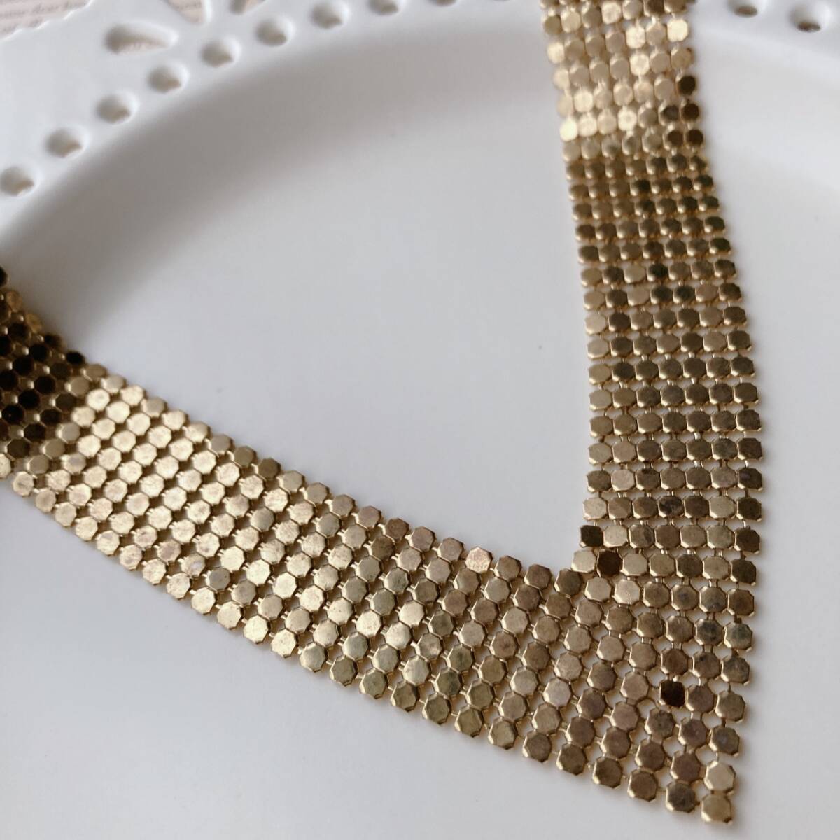 ネックレス ショート ゴールドトーン V字幅広 メタルメッシュ アンティーク調 美品☆vintage jewelry accessories F0197