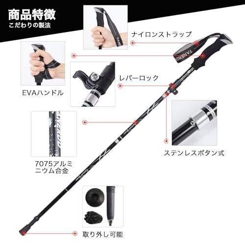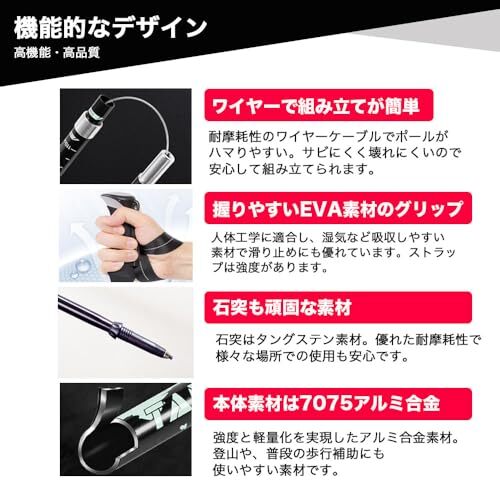 【商品仕様】本体:アルミ合金 グリップ:EVA材質 石突:タングステン鋼合金 収納時:30cm 使用時:95-110cm 重量:約250g(1本) 用途:登山、山登り、ノルディックウォーキング、ウォーキングなど