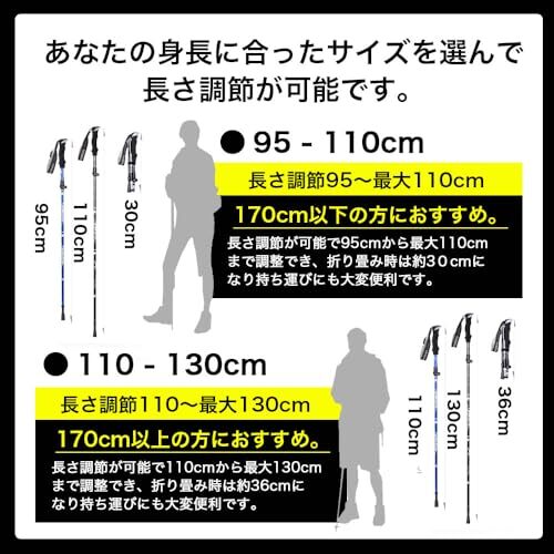 【こんな商品をお探しの方におすすめ】トレッキング、登山、ウォーキングや神社参りの際に膝への負担を軽減したい!勾配のある坂道や山登りの際に、 トレッキングポール や ウォーキングポール を使って負担を軽減したい方はおすすめです!サイズは2種類。95cm-110cmと110cm-130cmで選べます。重量はどちらもわずか250g〜290gと超軽量のトレッキングポールをお探しの方にもお勧め!折りたためるトレッキングポールで2本セットをお探しの方、初心者でも簡単に扱えるトレッキングポールをお探しの方はぜひお試し下さい。