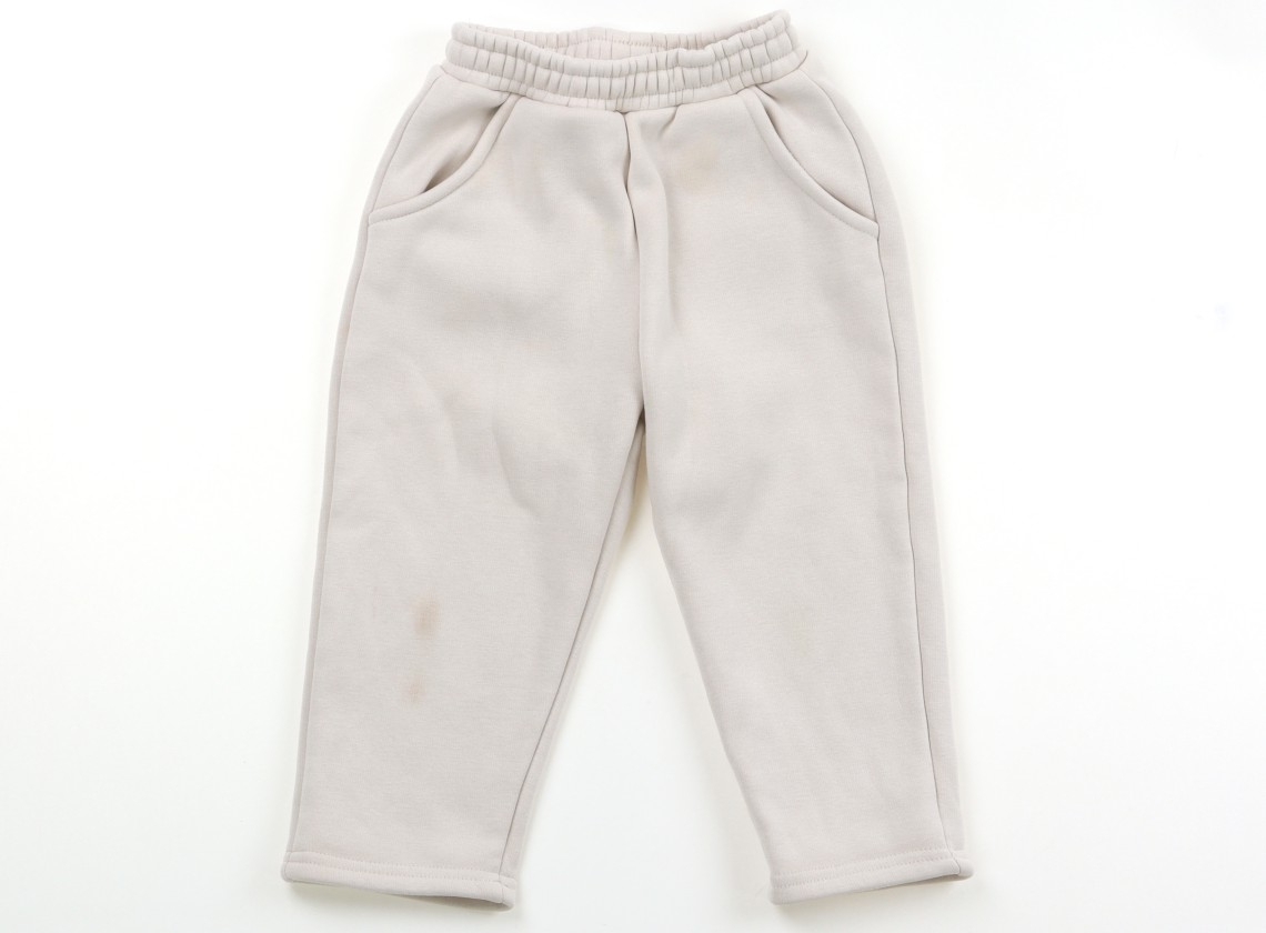 全体に使用感はありますが、洗い替え用にいかがでしょうか。ウエストは総ゴムです。裏起毛。ウエストゴムの左下、右裾にシミがあります。