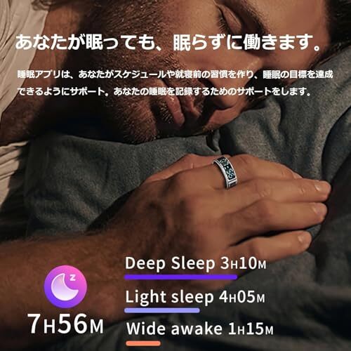 【昼も夜も、休みません。】睡眠もSR08スマートリングにおまかせ。睡眠アプリは、あなたがスケジュールや就寝前の習慣を作り、睡眠の目標を達成できるようにサポート。あなたの睡眠を記録するためのサポートをします。レム睡眠、コア睡眠、深い睡眠の長さも、目が覚めそうになったタイミングも一目瞭然。睡眠の傾向を見て、目標の達成具合をチェックすることもできます。