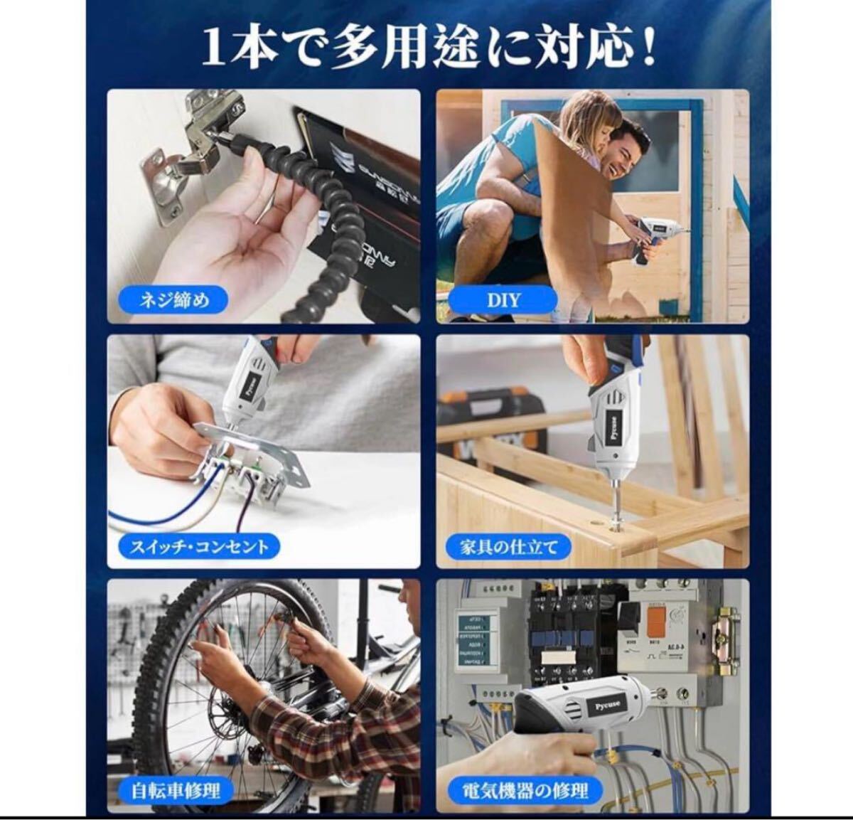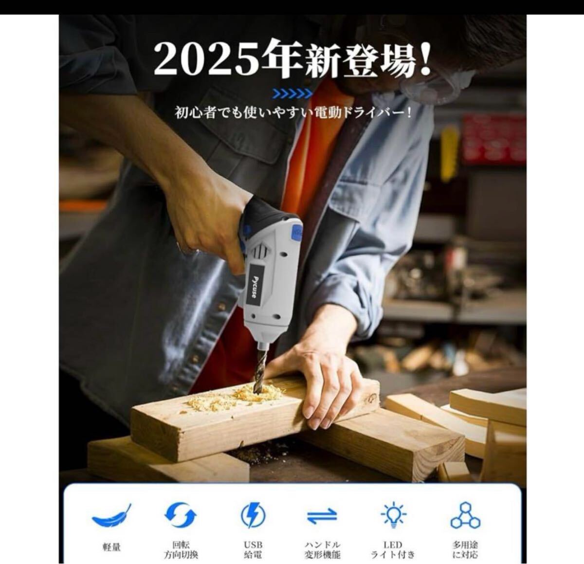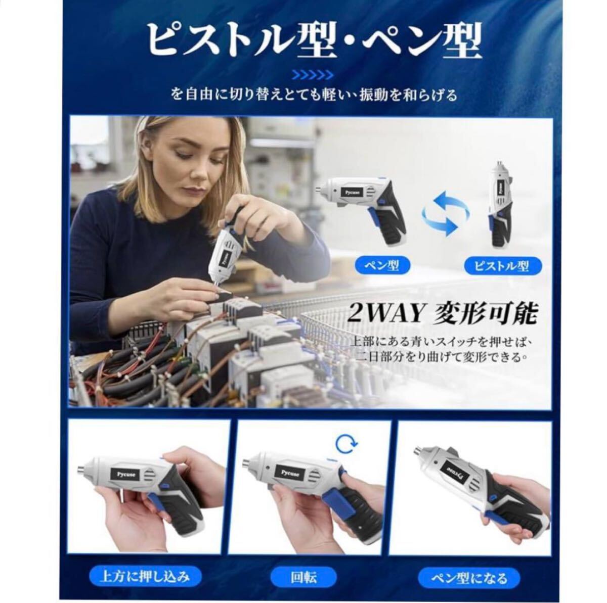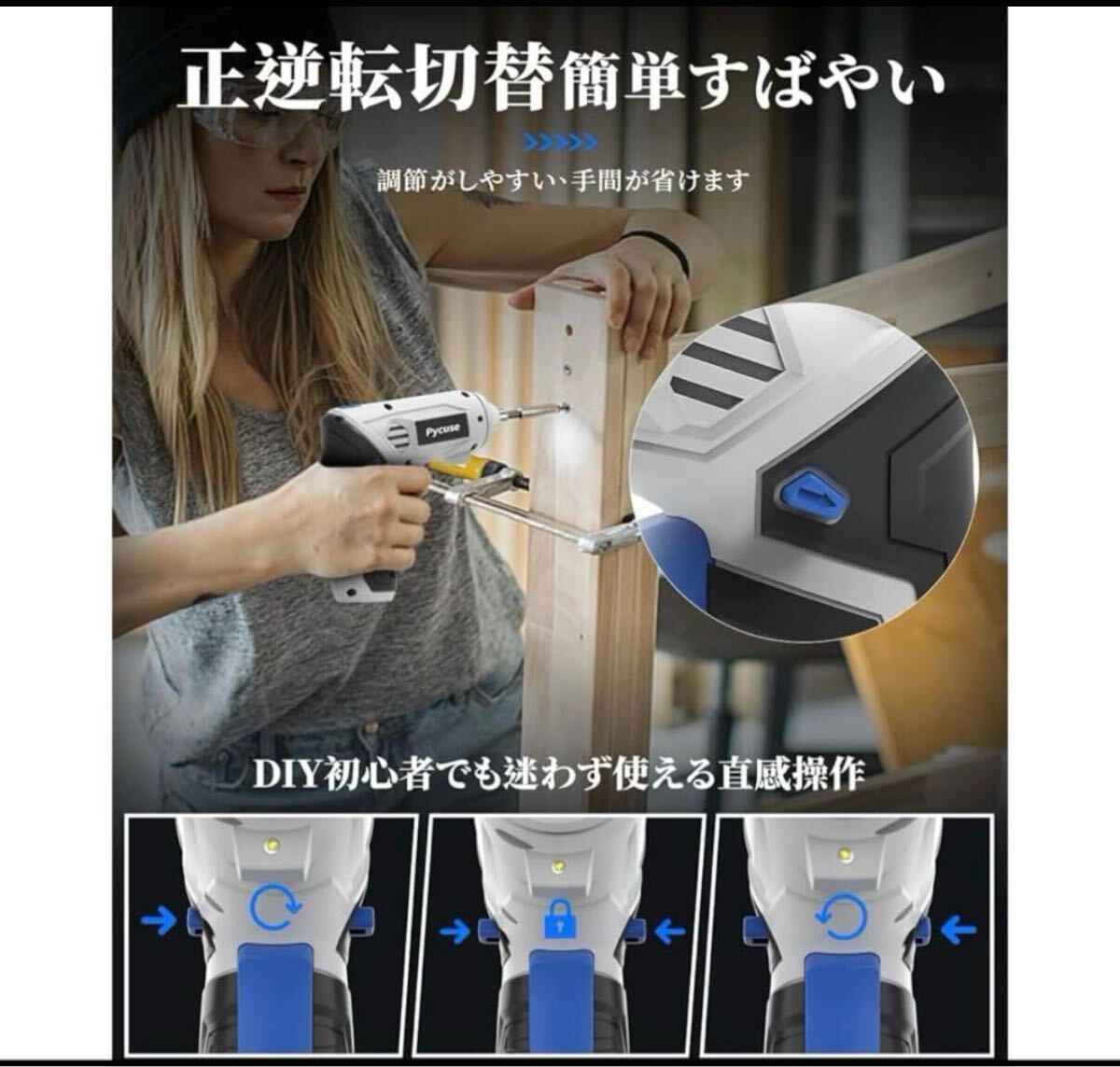 組み立てやDIY家具などの作業を格段にアップされる人気小型電動ドライバー、ボタンを押すだけねじを締めたり緩めたりすることができます。本体は約287.4gの軽量設計、また、コードレスや小型といった特徴があります。女性、老人 でも手軽に使えるサイズ感。