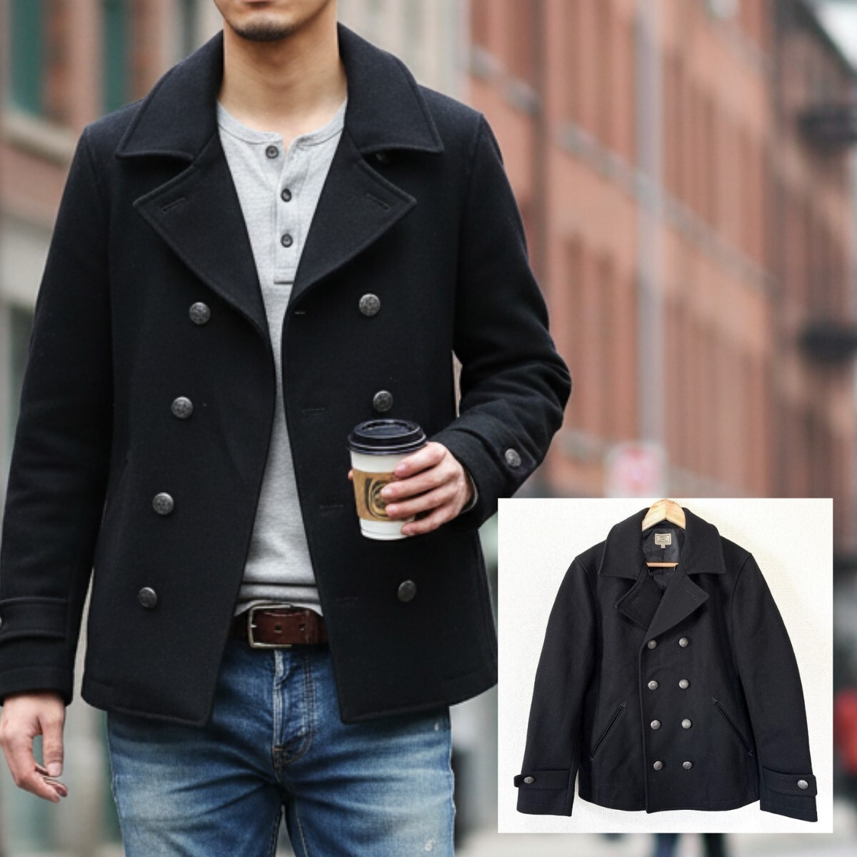 コートの定番、ピーコートになります。カジュアルスタイルやビジネススタイル、さまざまな場面で活躍するアイテムです!!多少の使用感あり、後ろに毛玉見られます。