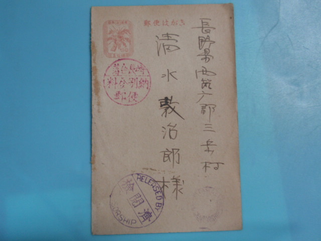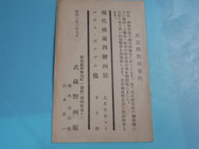 昭和23年 武蔵野画廊・開館案内 仙人画家・清水敦次郎(敦治郎●宛名誤字 太平洋画会、示現会)あて 検閲印 検閲済 CENSORSHIP